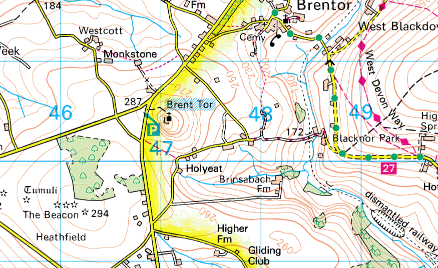 On a clear day however you get to look at all the fine tors along the western side of Dartmoor. Brent Tor is separated a bit from the main part of the moor and gives great views to the east. In view here is Sourton Tor furthest left, then up over the Corn Ridge to Great Links Tor (the highest spot), Hare Tor is right of that