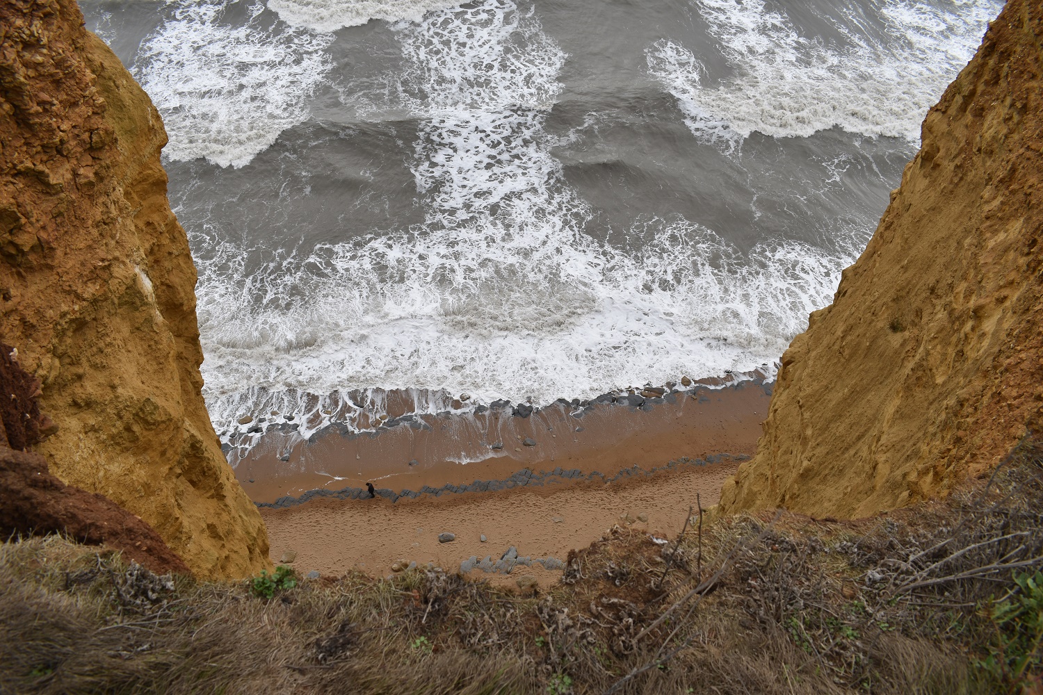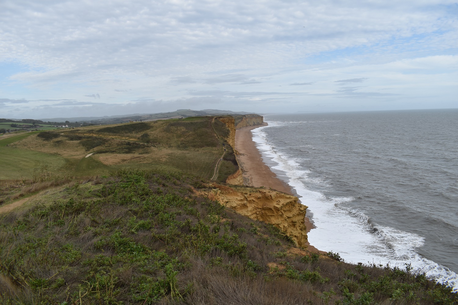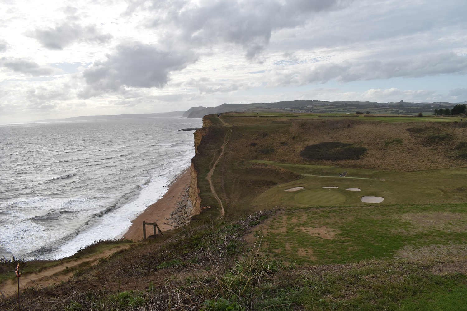 Now this cliff is treacherous. I thought last weeks walk at Budleigh Salterton was in danger of the sea. But this is something else, I’m about 2 metres off the coastal path here looking straight down at the beach. There is also a golf course tee and green behind me about 10 metres away, precarious indeed