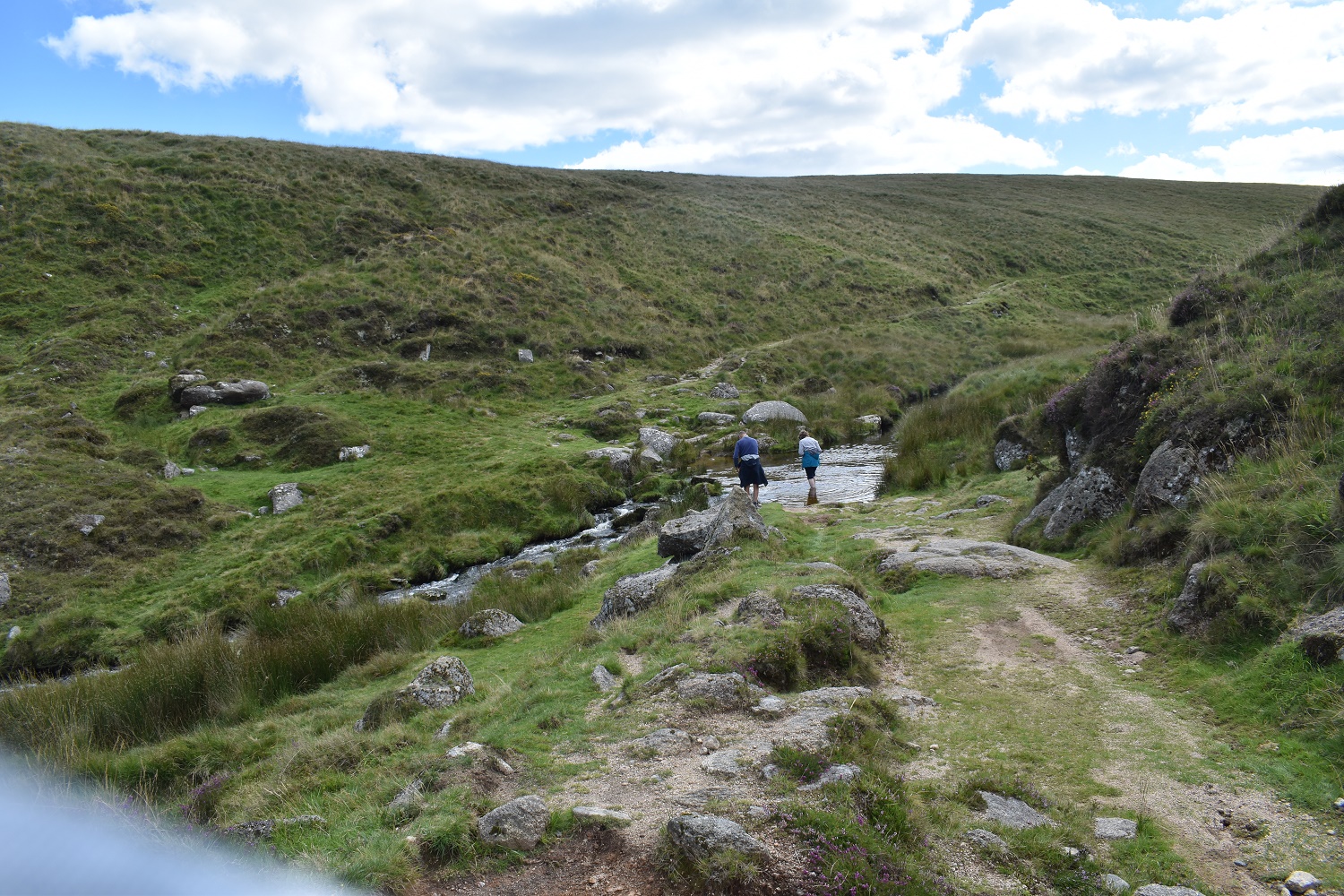 Knack Mine Ford. Now I could these two from about half way down from Steeperton Tor, they tried to cross at least 5 times without success, I went about 10 metres downstream from the ford and jumped the River Taw which is narrower either side. Now these two, they faffed a while before taking off their shoes and wading