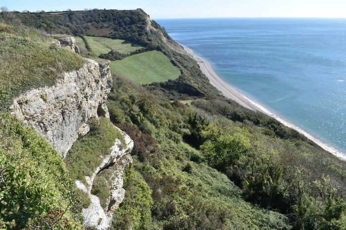 Looking down to Weston Mouth, and this one requires a drop all the way to the beach before a climb up again to Weston Cliff at 162 metres
