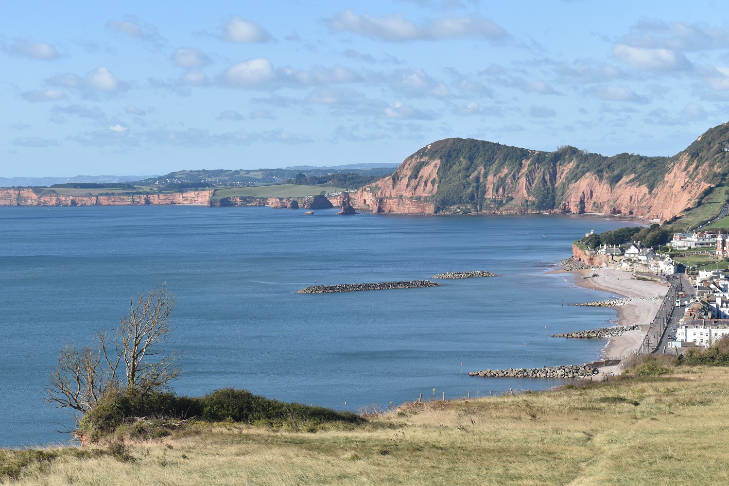 Groynes sit just off the beach protecting Sidmouth sea front with the Jurassic coast stretching towards Budleigh Salterton beyond. You can see the sea stacks at Ladram Bay by the big hill over there