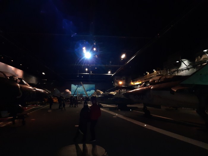The planes on deck include Buccaneers, Sea Vampires, Wessex helicopters and Sea Hawks. There is also a Phantom which is setup like it is about to take off
