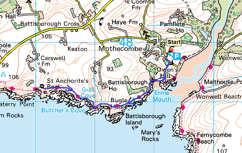 Route – Mothecombe Beach – South West Coastal Path – Bugle Hole – Gull Cove – St Anchorite’s Rock – and back
