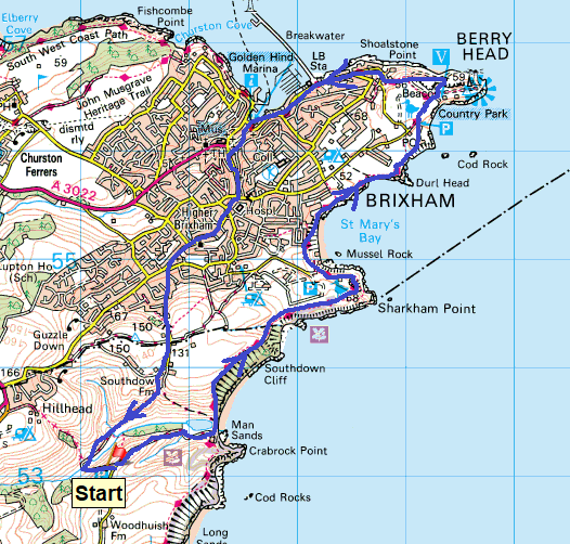 Route – Man Sands – Southdown Cliff – Sharkham Point – Berry Head – Brixham – Southdown Hill – Southdown Farm – Man Sands parking