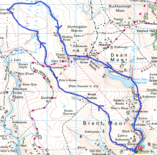 Route – Zeal Tramway – Broad Rushes – Petre’s Pits – Western White Barrow – Crossways – Redlake – Green Hill – Fishlake Rocks – River Avon – Broad Falls – Huntingdon Clapper – Huntingdon Cross – Western Wella Brook Clapper – Avon Dam and Reservoir – Brentmoor House – Shipley Bridge