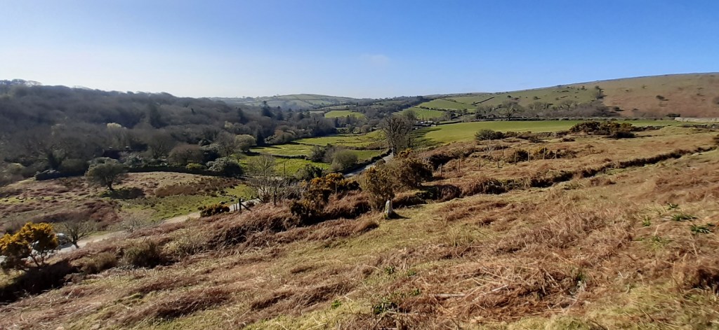The gorse was smelling lovely here, that’s Black Tor on the hill. The trees holds an old ruin