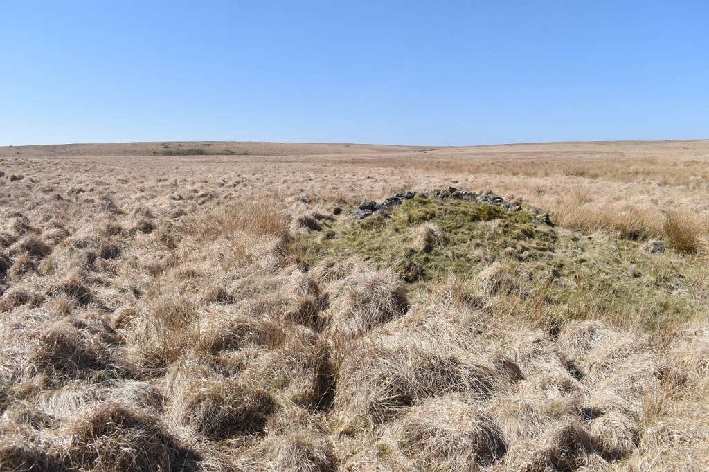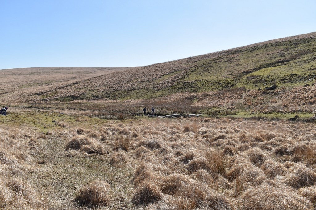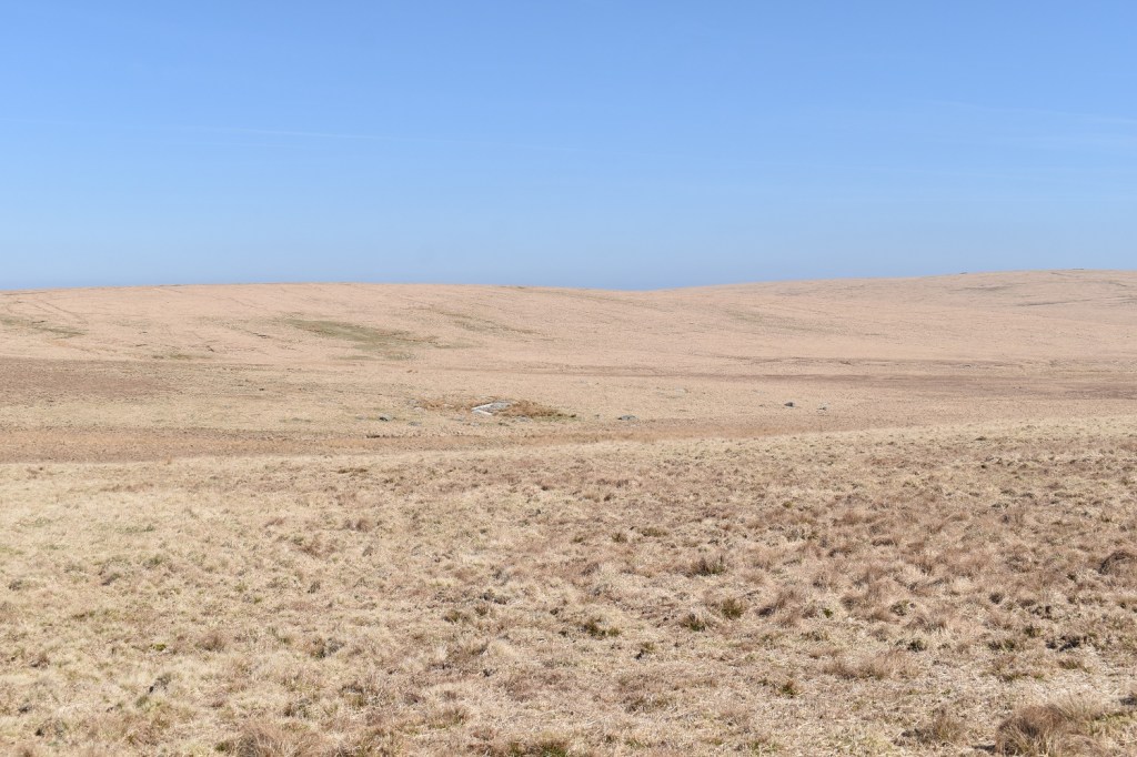 This is a tinners hut in Fishlake Mire. The green part of the hill in the distance is where I took the last photo. As you can see it is very tussocky and thick yellow grass. The faint track you can see on the left side of the photo has led me here nicely. You can also see the path when stood on Green Hill. However from here the path became very faint, so I stayed on the higher lumps and away from the swampy bits