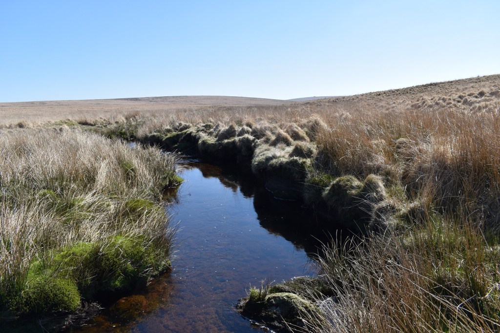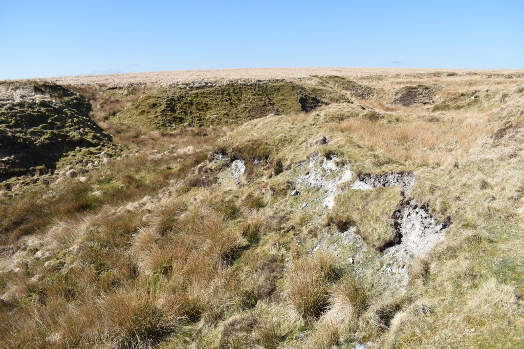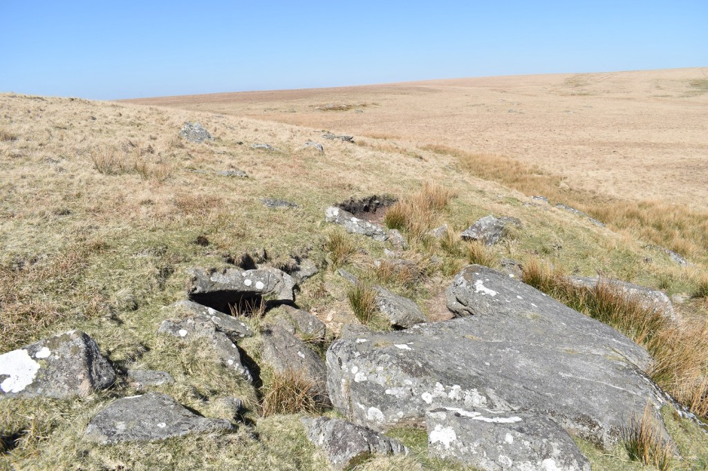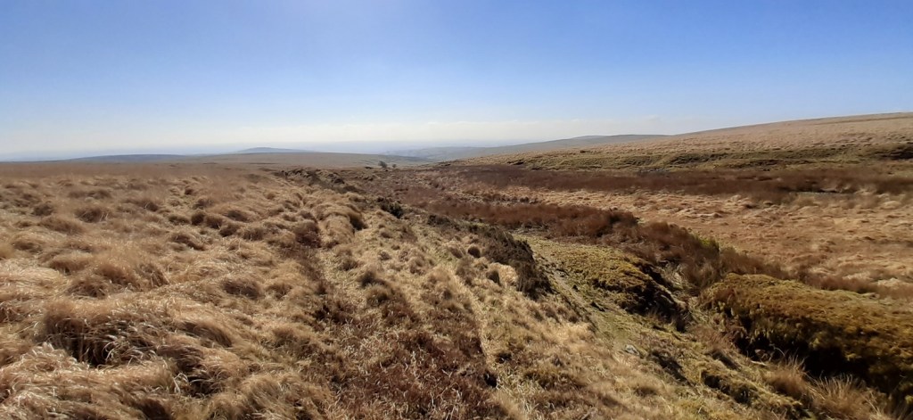 Just a little further on and slightly west of the tramway is Petre’s Pits, both this and the tramway are Dartmoor 365 squares, so another 2 ticked off today (there are others on this walk but I’ve visited them previously, here to find them all). As I walked over to look into the pits I disturbed a buzzard eating, not best pleased they scarpered as I’d got to within 20 foot of it. I tried taking a photo but it was low and blended into the banks opposite