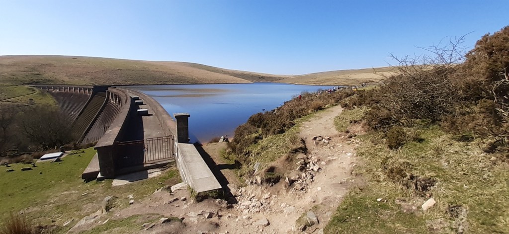 The tarmac path which leads to the dam. Grippers Hill is ahead