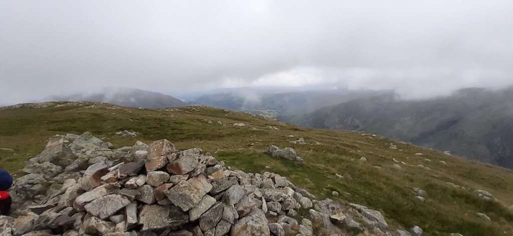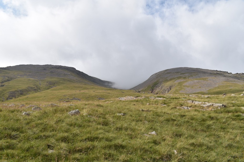 The cloud was up and down like a yoyo as we dropped back to the col. Green Gable is ahead somewhere!