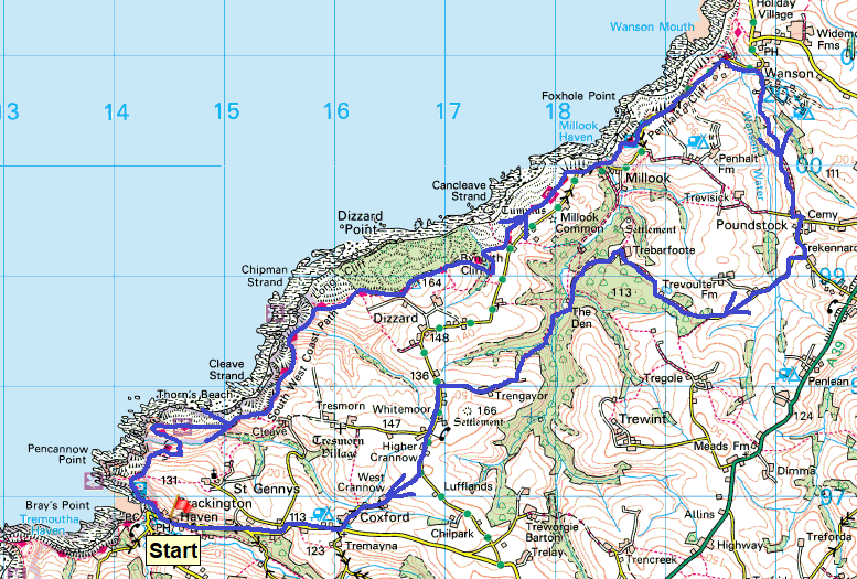 Route –South West Coastal Path – Pencannow Point – Cleave Strand – Dizzard – Cancleave Strand – Millook – Penhalt Cliff – Wanson – Poundstock – Trebarfoote – Millook Woods – The Den – Trengayor – Coxford – Crackingon Haven