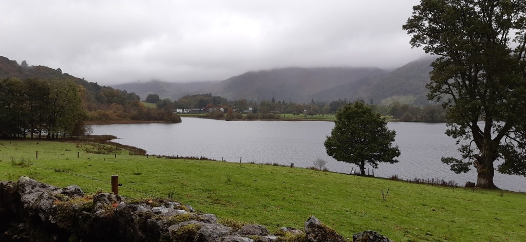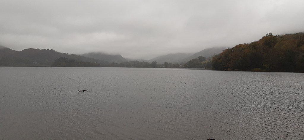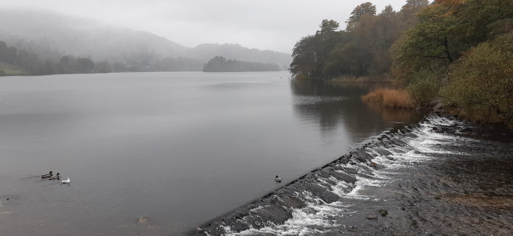 Before the drive down to Grasmere, the day before I had set off at 4am on the long drive north from Plymouth. The sun was shining at times on arrival in the Lakes, here I look across to CatbellsAnd along Derwent Water as well towards BorrowdaleNow to Grasmere the next day. I’d met my uncle and auntie and refreshed ourselves with coffee and pancakes in the village over there first, before setting out along Red Bank Road, you get plenty of views down to the lake whilst walking the road as you can see the cloud is down on the fells at the backRed Bank RoadNab Scar is under the clouds across the lake on the left, and part of Loughrigg Fell on the rightLoughrigg Terrace and the now brown bracken as we head through the woodland to the beach section of the lakeNormally the view here is to Helm Crag, Seat Sandal and Dunmail RaiseThe weir and some ducks, one of which is starting a climb up the centre of the weirSome nice colours in the woodlands as we head to the road back to GrasmereThere had been a few runners heading past us on our circuit of the lake, this was the reason why. A Biathlon (think its biathlon, two events, one bike one run), the finish was here in GrasmereThere was barely any movement in the River Rothay in Grasmere, a few days from now it would be racing through here after lots of rain. Still for now we’d enjoyed a walk and headed back to Keswick for some food and drinks.