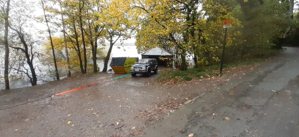 The National Trust pull a vehicle out from the flooded shed, they’ve also lashed the skip to the tree to prevent it floating away