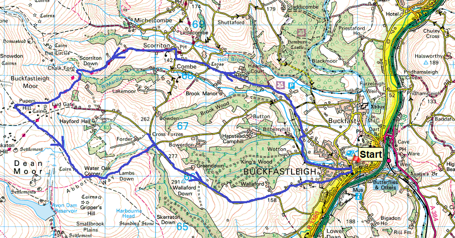 Buckfastleigh, the Globe would be frequented at the end of the walk for a quick pint. The car park is up the road on the right and I’ve walked a short distance in to take the photoThis should be called church corner or something of that ilk. There’s a Catholic, C of E, Methodist and Christian community churches all here.Expansive views starting to come as I cross the River Mardle to the road to ScoritonThe woods on the left hold Hembury Castle as I follow the road to Hawson’s CrossWooded roadDartmoor proper is ahead, think that is Snowden and Ryders HillHawson’s Cross with Stumpy Oak behind, a new oak has been planted for when Stumpy hangs up his leavesLovely scenery around hereI’m on the track from Scoriton to Chalk Ford now, passing the farm machineryAutumn colours and Snowden in the distanceChalk Ford, there is a tor in the woods to the left which I’ve seen before but never visited properlyToday I went to look at the top rocks, there are plenty below by the River MardleA peek out to South Hams as I start the climb to Pupers HillAll browns and yellow, the field over there holds a herd of deerThe views start to expand now as I get higher, with the tors around Hameldown and Haytor coming into viewThe first outcrop of Pupers Hill that I hit, there’s more away to my right, but for now I rest after the climb and look along the path towards Water Oak CornerPupers Hill cairn and Hameldown in the distanceNorth to Snowden from Pupers HillWalking the track to Water Oak Corner and I spy a glimpse of Avon ReservoirThe clump of trees ahead is Water Oak Corner, an attempt to plant some trees into Dartmoor properIt was lovely up here todayA very strict permissive path leads you off from Water Oak Corner, up there in the distance. Don’t stray from the path says the signStill on the path down to Dean Burn ClapperFar reaching walks from this point, just make sure you stick to the waymarked path. I’m heading leftOver Dean Burn ClapperI then did an out an back to Cross Furzes before heading off to Wallaford DownAlong the roadThink that Pupers Hill this timeThe lump on the left is Wallaford Down, the Dean Burn is in the valley to the rightFrom the road to this point is about as good as it gets on Wallaford DownThe views from the road however to South Hams are brilliantGreen fields of farmlandAnother long road section now into Buckfastleigh but the views are still pretty goodWallaford CrossInto Buckfastleigh now and a memorial ready for the 11th hour of the 11th day in the 11th month. A really good walk in great weather. Buckfastleigh isn’t a place I start walks from but it has some lovely lanes around it but it is always uphill from here to start with! At least it means its downhill on the way back.