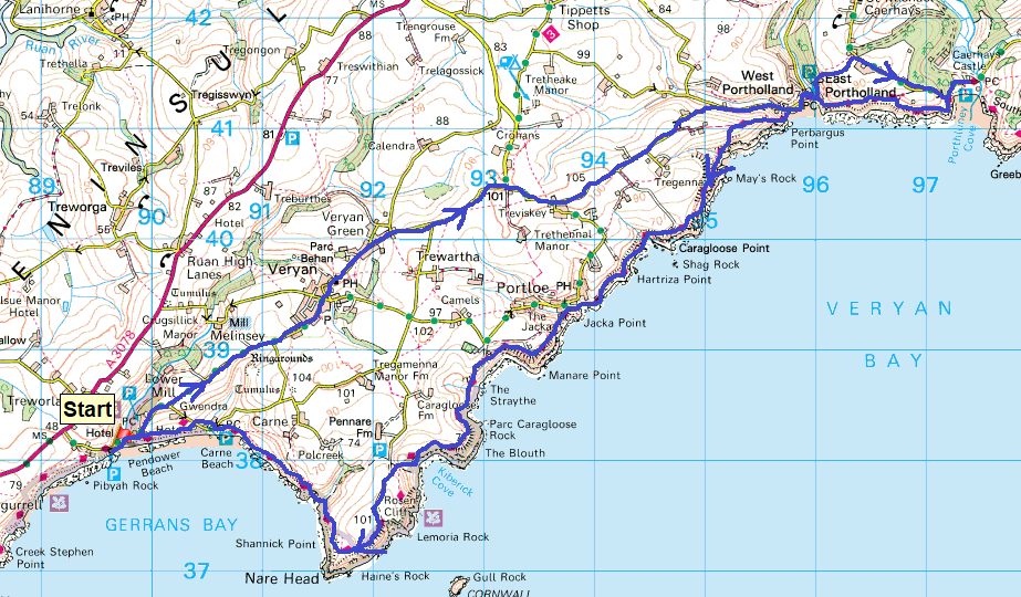 Route – Veryan – Veryan Green – West Portholland – East Portholland – Caerhays Castle – South West Coastal Path – East Portholland – West Portholland – Caragloose Point – Portloe – Manare Point – The Blouth – Rosen Cliff – Nare Head – Carne Beach – Pendower Beach
