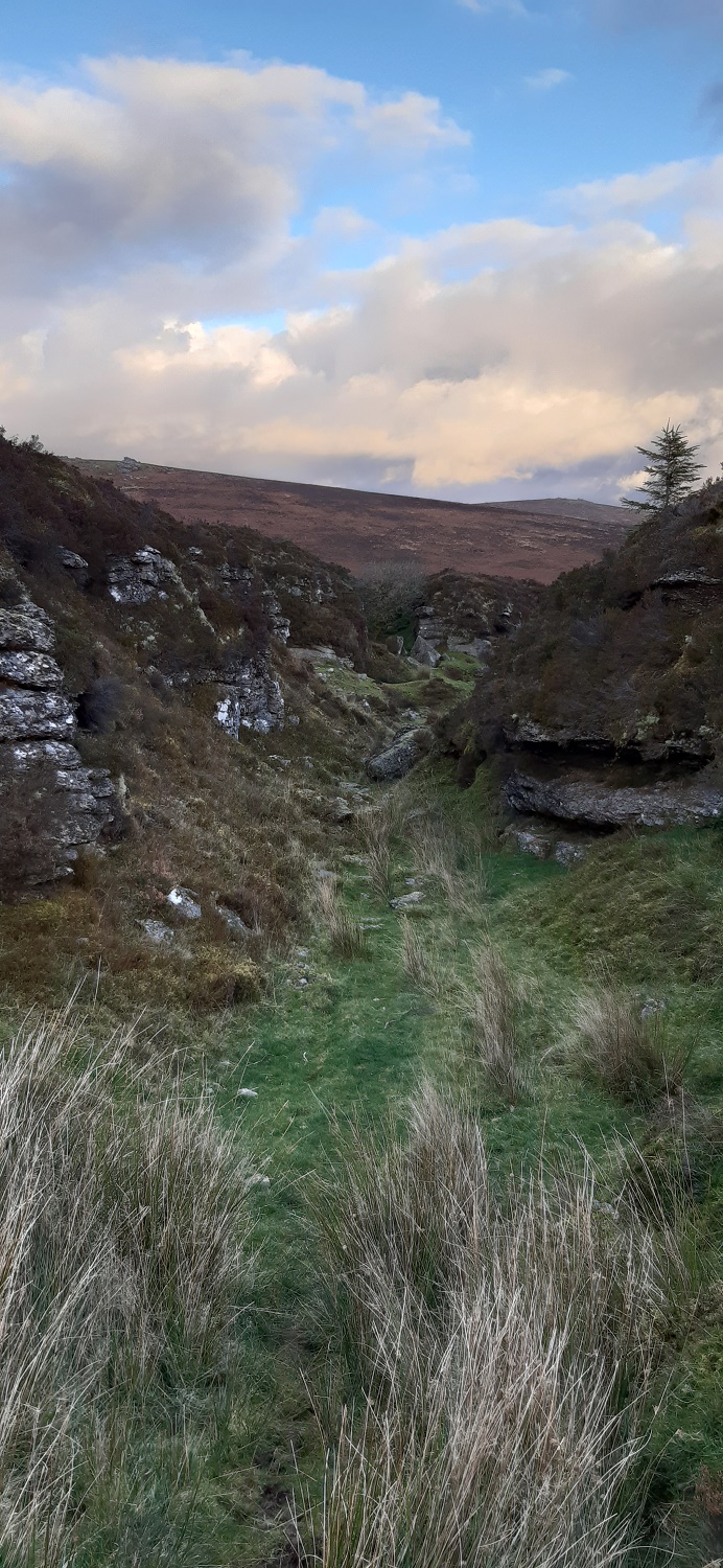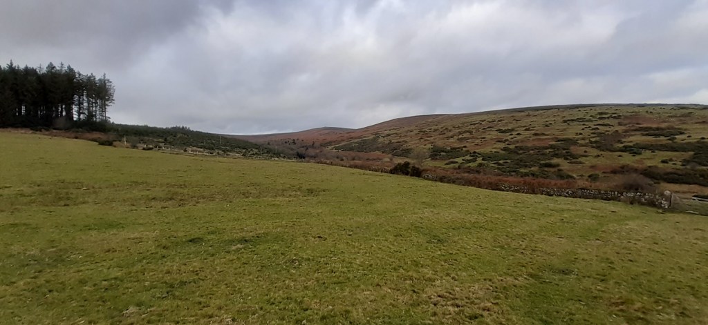 Widecombe church to start with, the cafe is just to my right, the fires were on in there and food and drink was good.From the car park there are views up to Chinkwell Tor (behind the tree) then Bell Tor and finally Bonehill Rocks in the dip