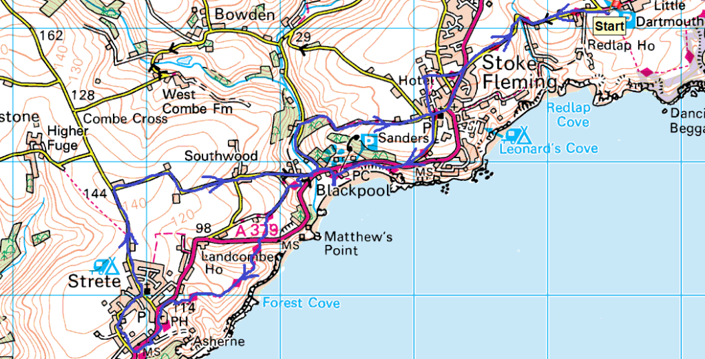 Just out of the car park and through a gate the sea can be seen, that’s Start Point sticking out over there and Stoke Fleming on the rightThe national trust car park, two parts to it and space for probably 30 cars, it says parking is £3 but I couldn’t see a box to put the money in, although I’m a NT member alreadyApproaching Stoke Fleming with the church sticking up, the bells were ringing for the church service this morningThe coastal path heads inland along a couple of lanes through Stoke Fleming and took me past the Dartmouth Petanque club, plenty partaking on a Sunday morningStrete can be seen now on the hill on the right in between me and there is a dip holding Blackpool SandsStarting to drop down towards Blackpool nowOut on to the main road and on the pavement gives you the view to the sands below, the beach looked lovely from up hereThe yellow building behind the sign to the left is the cafe on the beach, there’s plenty of options in there but I just took a coffee and followed the signs to Strete off to the right hereClimbing back up away from Blackpool Sands and an even better vantage point to see the beach. Large parts of the beach where a little stony but there was plenty of sand nearer to the water. Across fields above Matthew’s PointI think this is Forest Cove or Middle Cove, I’m going for the latter as I think Forest Cove is on the right from here and Matthew’s Point is on the left. As you can see this section involves more up and down and takes on more of the normal coastal path feelingAt the top of the hill now from the last photo. That’s Matthews Point sticking out down there beyond the beach. With Blackpool Sands in view beyond thatA lovely aspect along the coast with the Mew Stone which sticks up off Froward Point in viewThe path ahead with signs of housing in the trees which is the village of Strete, the coast stretches on to Start Point. I next walked through the village of Strete and out the other sideThis section of path meets up with my last visit to the area with the boys back in November (here). I next headed inland along lanes to loop around the back of Strete and start heading back. This photo also gives a view of Slapton Ley, the large freshwater lake cut off from the sea by the bar of sandStrete churchMore lane walking brought me to a bench and this view across fields which did for a coffee and biscuit stopNorns Cross saw me turn and head towards Southwood FarmThe church at Stoke Fleming in sticking up and can be seen, the dip will again hold Blackpool SandsCows at Southwood FarmDown the hill to Blackpool, classic Devon hedging either side of the lanesAt Blackpool I took a left away from the beach along a lane and then followed a bridle path track uphill through woods, at the top of the climb these views could be seen down towards Bowden and on to BlackawtonThe other way the sea was in view, on my outward part I would have walked past those trees sticking up over there on my way down to Blackpool SandsNot sure this house still supplies the villages electricity!! At this point I was walking the main road, which can be very busy and has no pavement at all and squeezes itself through high walls and houses. I can see why the coastal path through Stoke Fleming heads inland a bit past the Petanque clubFinal photo along the lane back to Little Dartmouth car park at the end of an enjoyable walk, the church can be seen again in Stoke Fleming.