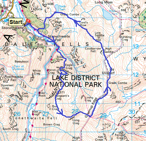 Route – Stonethwaite Beck – Eagle Crag – Sergeant’s Crag – Long Crag – Greenup Edge – Ullscarf – High Saddle – Low Saddle – Green Combe – Dock Tarn – Lingy End – Stonethwaite