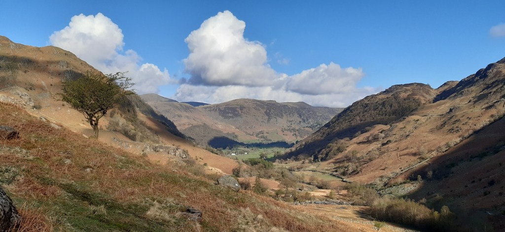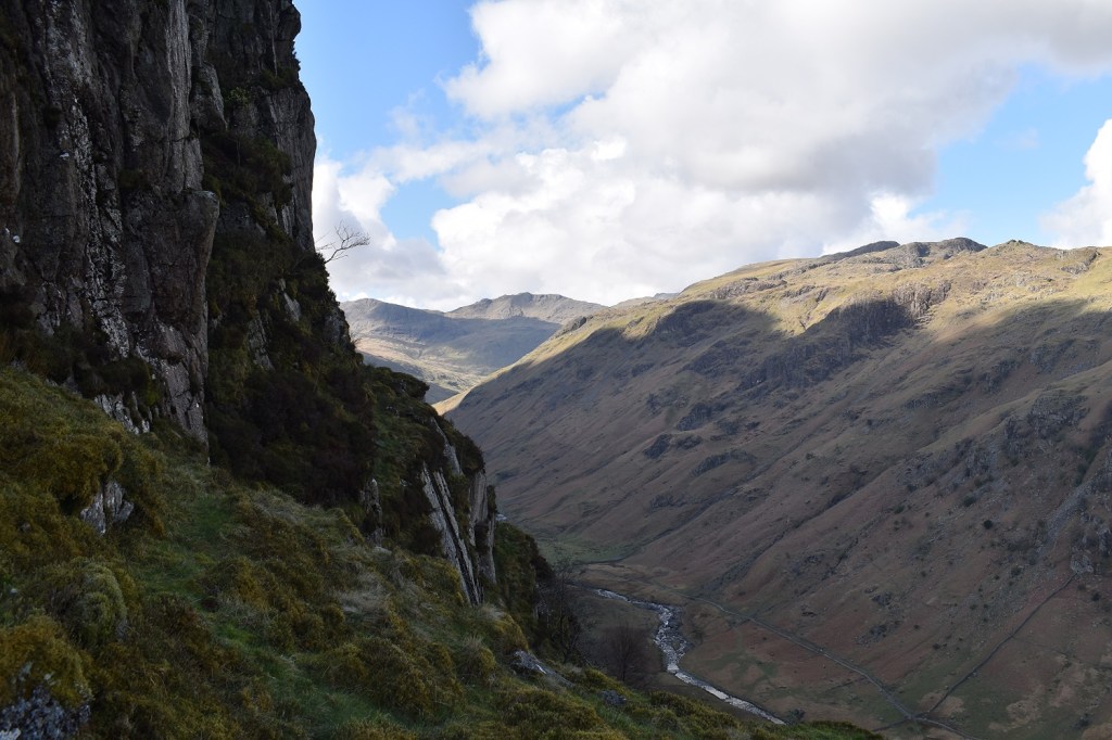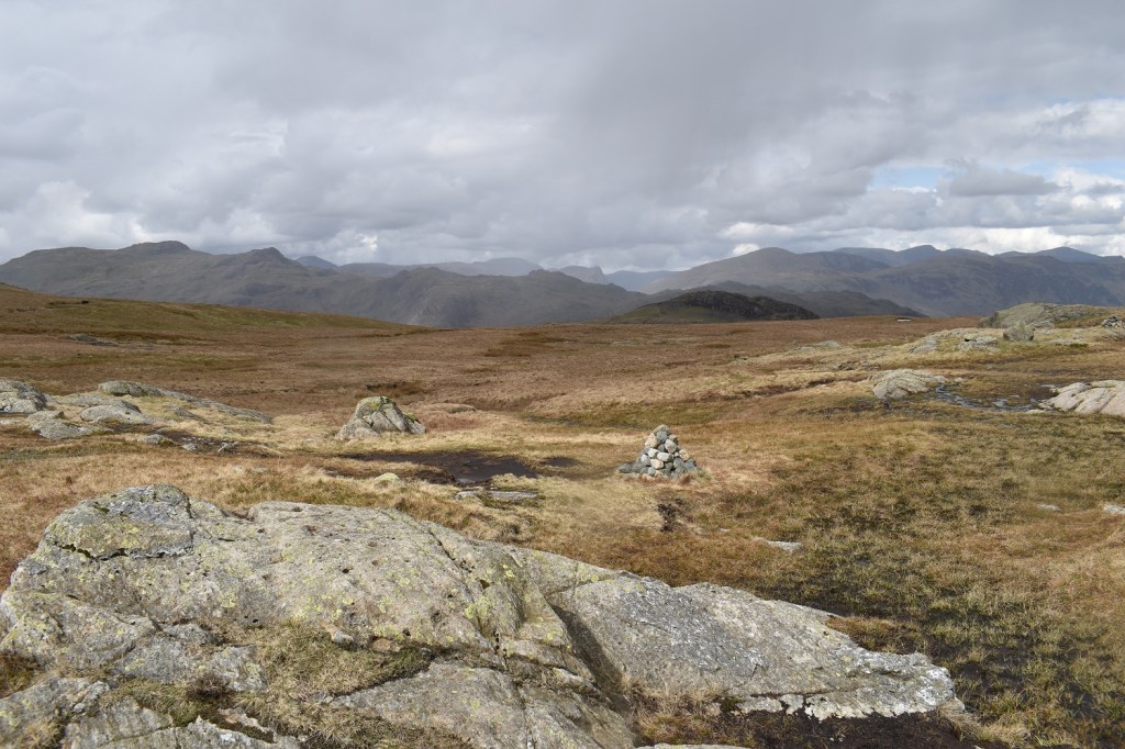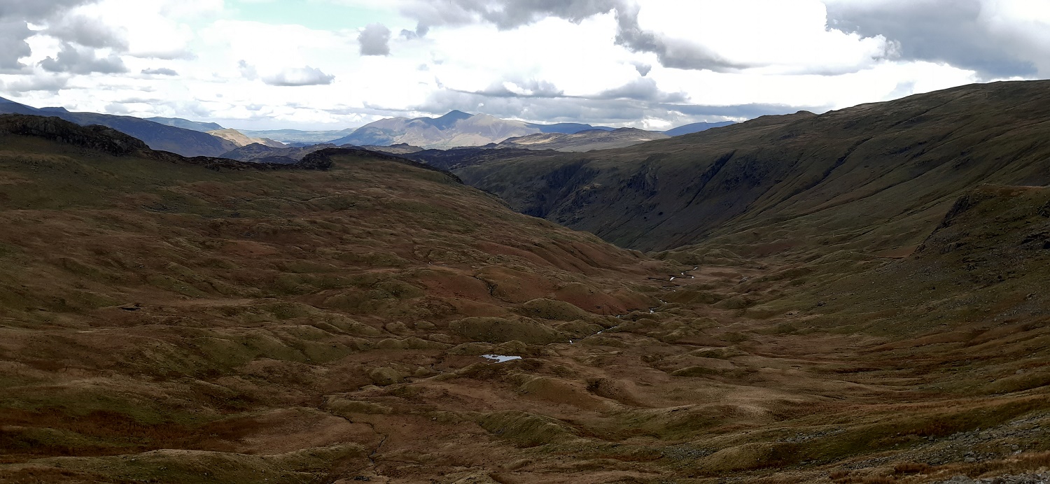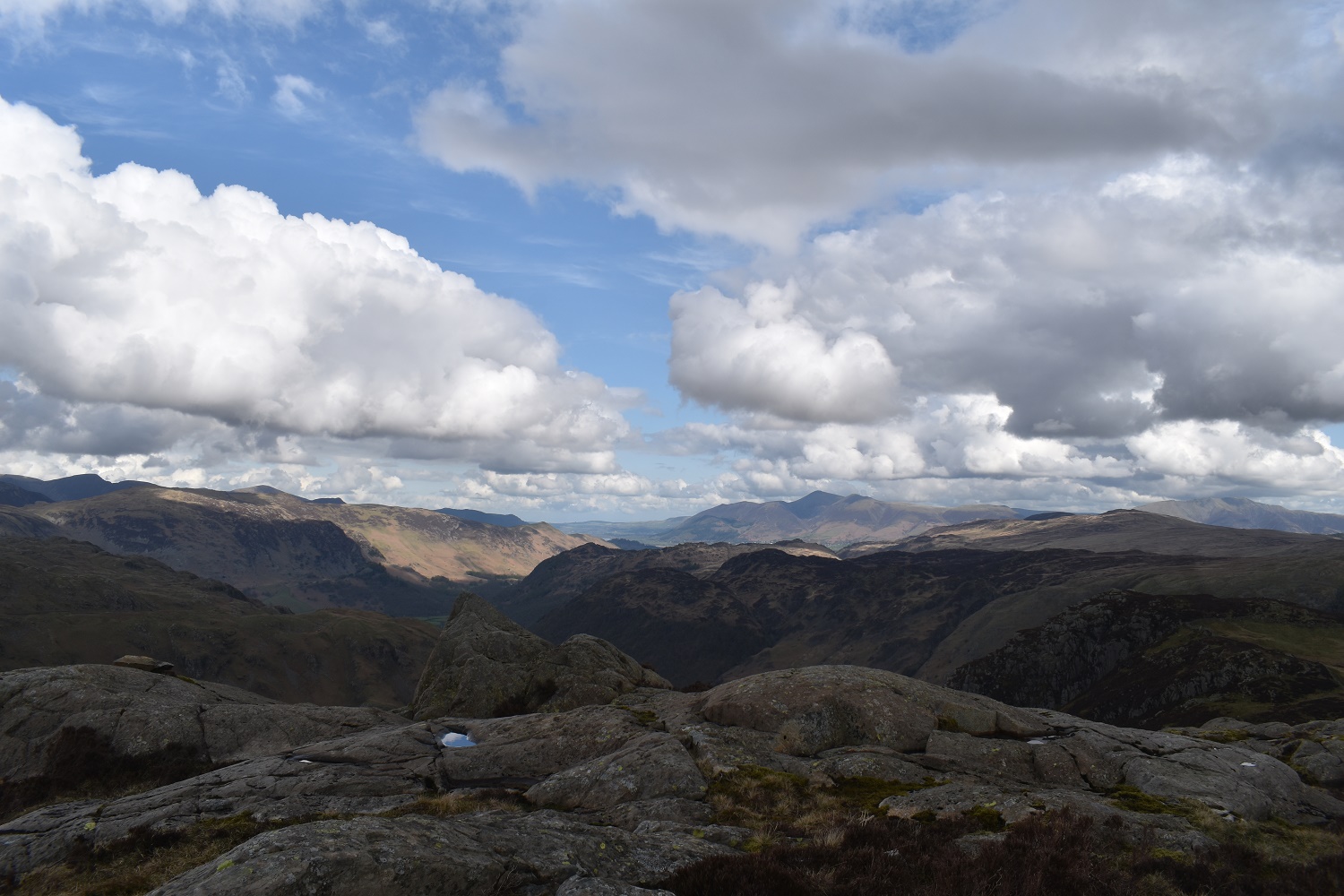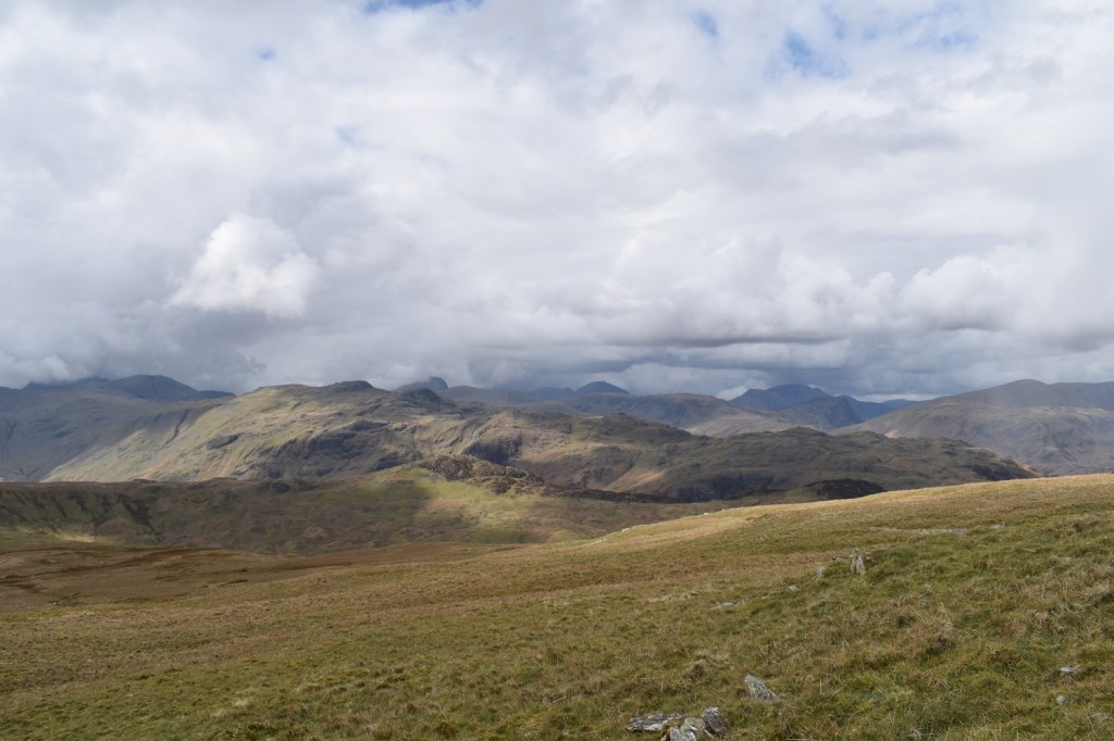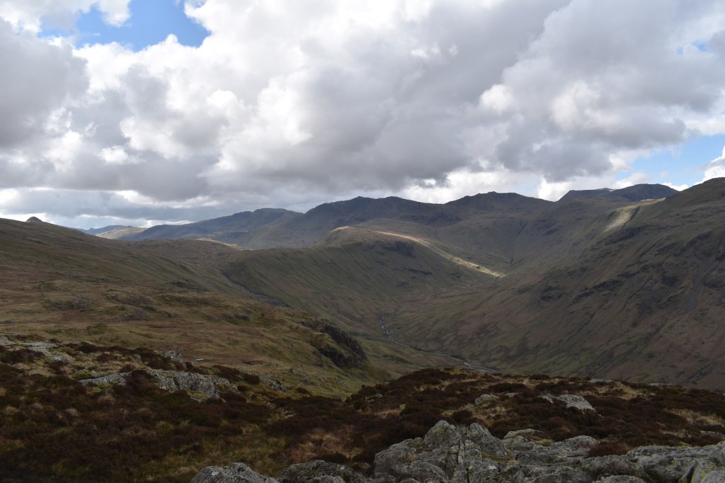 After following the grassy path above the stile I stopped here for another breather and look at the view. The fells are appearing in the distance now, Dale Head is back left and Skiddaw back right over Great Crag. From here you can see my descent route which will be down Willygrass Gill (the deep cleft on the hillside opposite) into those trees in the sun below.I’d climbed up the grassy, slightly rocky rake/scramble bottom centre of this photo. You can see the rowan tree mentioned by Wainwright in his book (not in leaf currently on the left of the rake as I look back down, on your right as you ascend). To follow the path you turn right on to that shelf above the rowan tree, seen here. I made a mistake here and went to look at the view that Wainwright speaks of, which is 40 metres on from here, the view is similar to the last photo above, I forgot to return here to carry on ascending. Don’t try to ascend from near to the viewpoint as I did. This view on this photo is along the glorious Langstrath, pointy Bowfell in view at the far end, Glaramara up on the right across the valley.To get here to this view was 30 minutes of messy, hellish crawling, descending to re-ascend, over heathery ground, mossy rocks and places I shouldn’t have been in. At one point I looked down and considered descending back to the valley above Greenup Gill and trying again. I saw an easy heathery rake though and once I’d descended the 10 metres down I could easily join the bottom and get up to the top, arriving from the eastern side of Eagle Crag instead of the west. Sergeant’s Crag is over on the left and an easy walk from here, left of Sergeant’s Crag is the dimple of Pike O’Stickle. Right of Sergeant’s Crag is (in order) Crinkle Crags, Bowfell, Esk Pike and in cloud is Ill Crag. Langstrath is belowFrom the summit of Eagle Crag (small cairn is gone). Skiddaw is clearly seen back right now and the ridge running from Catbells up past Maiden Moor to High Spy is in sun across the centre of the pictureIt was only 20 mins to Sergeant’s Crag with a similar view, after the excitement of Eagle Crag I was starting to enjoy the walk again now, and had a lovely chat with a couple who lived in the Lakes, and were ticking off the Wainwrights. They had done the sensible thing and walked up Greenup Gill to level with the saddle between Eagle Crag and Sergeant’s Crag, and then ascended over the moraines following the wall up to the small rock step by the stile.Sergeant’s Crag summit this time looking to a dark looking Fleetwith Pike over Bessyboot/Rosthwaite Fell, with Dale Head to the right of Fleetwith PikeLangstrath again and a good look at Crinkle Crags, Bowfell, Esk Pike, Ill Crag, Scafell Pike and Great End. Pike O’Stickle peeking up again on the leftI looped around Greenup Gill under Long Crag on a feint path, ascending at the end of Long Crag to cross a boggy area, you can see the moraines below from here. Lining Crag on the right hand side. Bit of hail was dropping here as the cloud came in a bit thicker.The crossroads between the Greenup Edge path and the one that crosses it from Borrowdale to Grasmere. This whole area is a bit squidgy with higher lumps of grass and rock to provide some refuge. The path is pretty clear though and can be followed closely to avoid the worst parts. rain or hail passing through at the backA lovely local giving me the head tilt as I follow Greenup Edge towards UllscarfHigh Raise rising up back left, with Long Crag on the downward slope. Backed by Bowfell, Esk Pike and the ScafellsLooking southeast with a bit of Grasmere and Windermere beyond that, layers of fells as well.Almost at Ullscarf and the cloud thickens further behind Glaramara which is hanging on to the sunUllscarf summit looking to Skiddaw in the distance, Blencathra and then Clough Head furthest on the right.The Scafells have vanished under the cloudWindermere from UllscarfBit of zoom whilst I have a brew with Ingleborough the shapely summit on the horizonThe rarely seen Blea Tarn, the boggy central ridge beyond that with High Seat the high point. The long Helvellyn ridge is on the rightAt the fence at High Saddle, Low Saddle down on the right sunshine lights up Grange Fell further on from that. And Derwent Water and Lake Bassenthwaite by SkiddawIts cleared up nicely again now as I look at Eagle Crag, I’ve drawn a red line which shows my route up Eagle Crag. Do not copy this, I certainly won’t be.More water in view now with Watendlath this side of Derwent Water. I’m heading down to the left here across another peaty boggy area towards Dock Tarn. Their is another feint path here from Low Saddle (where I am stood), which can easily be lost in the peaty parts, but a high hill in front of Dock Tarn can be used as an aiming pointSome lovely clouds passing through overhead casting a fantastic light over the fells, looking up along the Honister Pass here to Fleetwith Pike and High StileDock Tarn below, my next path heads out of photo to the left to the top of Willygrass GillFab view down Willygrass Gill, Lingy End is on the right and I will descend through trees to the valley floor. Eagle Crag and Sergeant’s Crag across the valley to the right of Greenup Gill