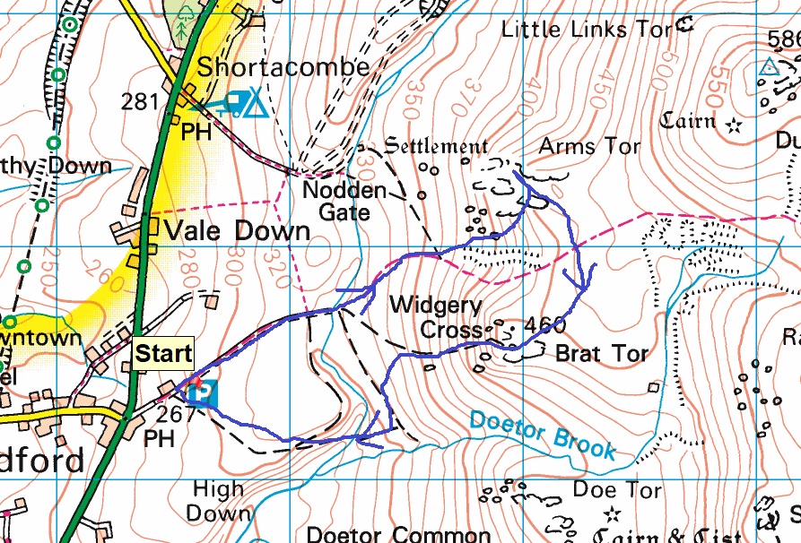 Route – Lydford stepping stones and Bridge – Arms Tor – Brat Tor – Widgery CrossBlack Rock – Lydford parking