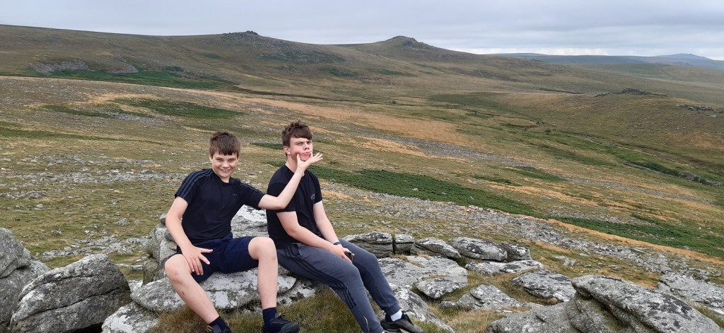 On Brat Tor, all smiles from the boys. Sharp Tor left and Hare Tor right at the back