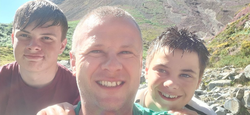 Well this was certainly the hottest I’d experienced in the Lake District in the 14 years that I had been coming up. Temperatures touching 30-35 degrees were being seen around the area. Places to swim rather than fells to walk were the order of the day. We were staying 10 mins walk from Derwent Water and we were using that regularly, alongside just chilling in the hottest parts of the day. However driving 400 miles and not having at least 1 or 2 walks would have been foolish. We’d done Low Fell and Fellbarrow on the Monday, and decided that Thursday would be good for another outing. I was hoping that Whiteside would be good, as I reckoned its westerly facing ascent might give us shade, if we went early. Plus the descent would be by a gill, meaning cooling off spots. I’d been eyeballing the ascent when walking Low Fell a few days before and figured it would be possible if we went early. Announcing to my two teenage boys that they would need to be up on holiday at a time starting with a 7, was equivalent to asking them give up ice cream during this hot weather. However they managed it and we arrived at Lanthwaite Green at 8.15am, unfortunately the ascent to Whin Ben looked like it had just started collecting the suns rays, Grasmoor next to it and the front face of Whiteside still had full shade, but not our ascent. Even at 9am we were sweating heavily, but we’d brought water, sun cream and hats and managed fine. By finishing the actual walking by 1pm meant that it hadn’t got blisteringly hot and the cool off at the end was a perfect finish to a brilliant walk. It meant that this visit we’d managed only more 4 Wainwrights, taking me up to 189 done, with my eldest on 60 and my youngest on 57 now.
