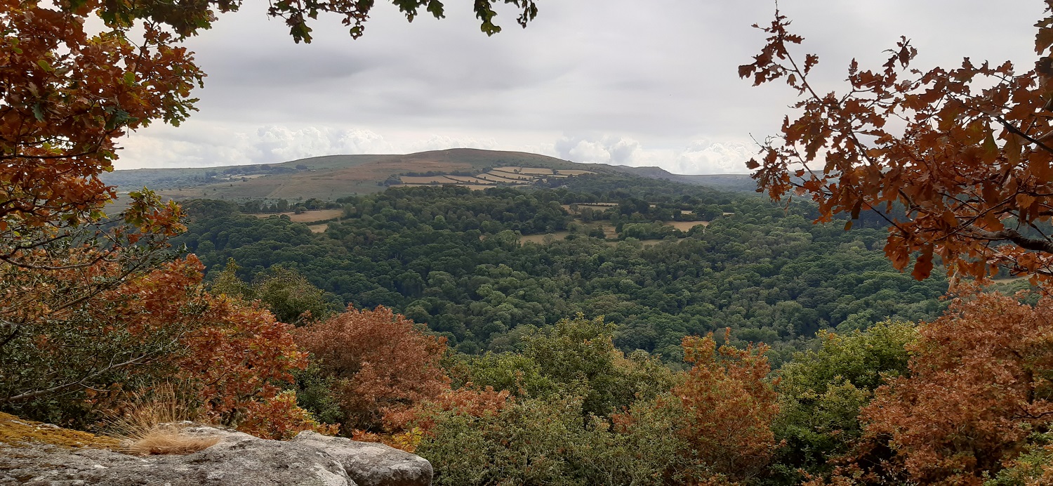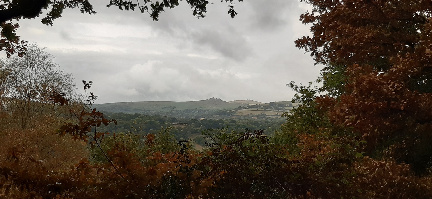 The view from beside Sharpitor to Hound Tor, the brown leaves of the trees showing the dry summer and the trees protecting themselves from the lack of water