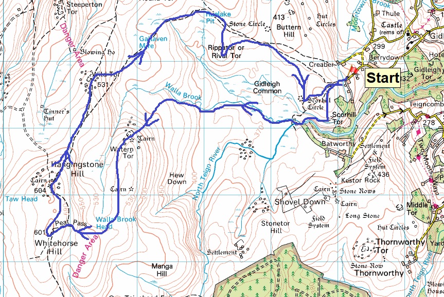 Route – Scorhill TorTolmen Stone – Walla Brook Clapper – Walla Brook – Watern Tor – Walla Brook Head – Whitehorse HillHangingstone HillWild Tor – Gallaven Mire – Gallaven Ford – Ruelake Pit – Rival Tor – Gidleigh Common – Scorhill Stone Circle – Gidleigh parking