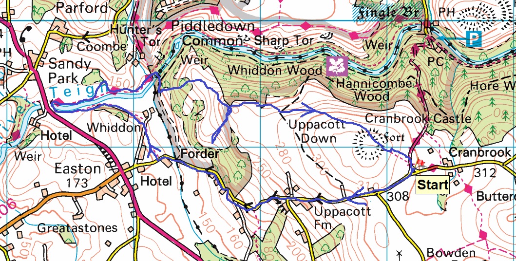 Route –  Parford Brake Tor – Whiddon Park House – Whiddon Park House Tor – Dogmarsh Bridge – Dogmarsh South Tor – Iron Bridge – Whiddon Park Tor – Whiddon Wood Tor – Great Parford Tor – Whiddon Wood Tor – Uppacott DownCranbrook Castle
