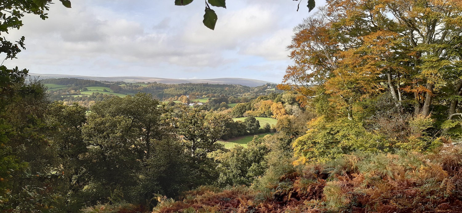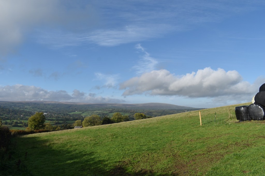 Plenty of green fields as we look down to Chagford with Meldon Hill on the left