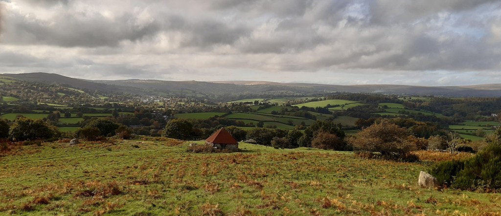 We dropped down a bit to the top of Great Parford Tor, again lovely views towards Meldon Hill, we are stood by the red roofed hut here