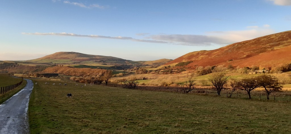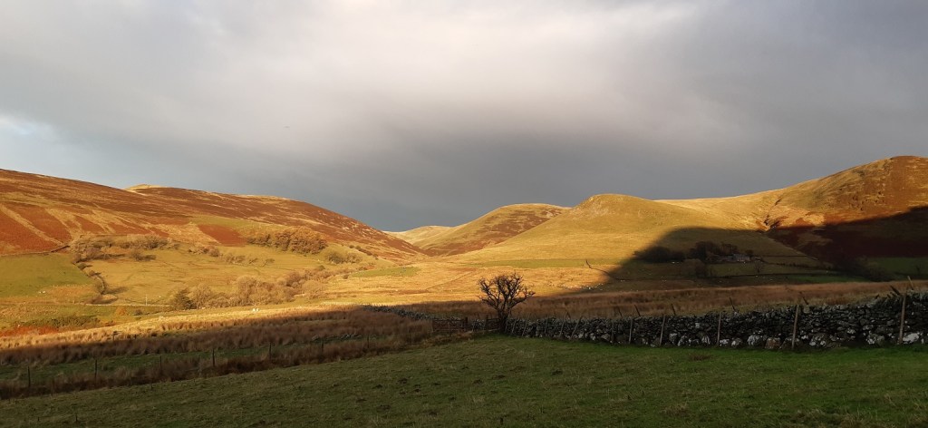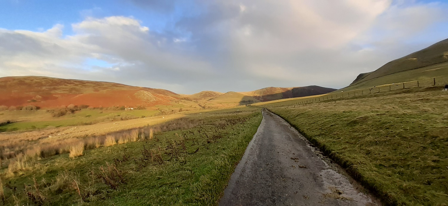 Starting out from Bassenthwaite and the avenue of treesThat was our cottage in the middle, the cattle barn to the left and Sale Fell at the backLooking along the valley holding Lake Bassethwaite, that’s Ullock Pike up to the left. In the cloud to the right would be Barf and Lord’s SeatLooking back and catching a piece of Lake Bassenthwaite and Sale Fell again (behind the tree)Peter House FarmWe went straight across the road at Peter House Farm and joined the lane which ends up at Dash Farm, Dead Crags are ahead on the rightFollowing the path which heads under Dead Crags, with Dash Falls now in viewWith all the rain the Lakes had, had over the previous weeks, it was no surprise to see the falls in spateBinsey can been seen peeking out as we look back, the rain was starting to fall a bit more nowCrossing over the top of Dash Falls the path switches and climbs a bit, Binsey just in view in the distanceWe’d walked the main path on the photo above for another 20 mins or more before we turned left after a stream to head up this path towards Great Calva up there, the path was muddy but the majority of the water was coming from above and sideways as the wind got stronger as we climbed.The summit of Great Calva, we’d seen hardly a soul on this walk but on arriving here a couple arrived from the Little Calva direction and then disappeared easterly towards Wiley Gill as quick as they came. We were glad to tick this one off and start the descentDescending the rain eased slightly and the cloud began to lift a bit to unveil Lonscale Fell. The views along the central cleft of the Lakes are well known from Great Calva, as you can see the valley as it runs from here passing Lonscale Fell and down Thirlmere to Loughrigg FellBack down the muddy path, I’d stopped to take of my wet t-shirt hence Linda waiting ahead of meMungrisdale Common appears opposite to Lonscale Fell as the cloud lifts furtherNow out of the rain looking back up to a clear Great CalvaThose with a keen eye will see Skiddaw Hause and the youth hostel centre right of photoA monotone look to the west but the cloud has a clear edge to it and there was brightness beyond it. Binsey is clearly in view and behind it we see Criffel in ScotlandA bit further on and its looking promisingPassing Dash Falls again, White Hause up to the left and…….…..looking the other way we have sun, Binsey catches the warm glowLooking along the valley which takes you to Trusmadoor and Meal Fell. I like that Dash Farm is in the shade of Dead Crags on the rightGlorious light and blue skiesLovely looking in every direction along hereSun is setting over Sale Fell as we near Peter House Farm againAn excellent set of hornsWalking back along the road you get views to Skiddaw and the Ullock Pike ridge on the right, a fine end to a tough walk and in early November a decent distance in the short hours