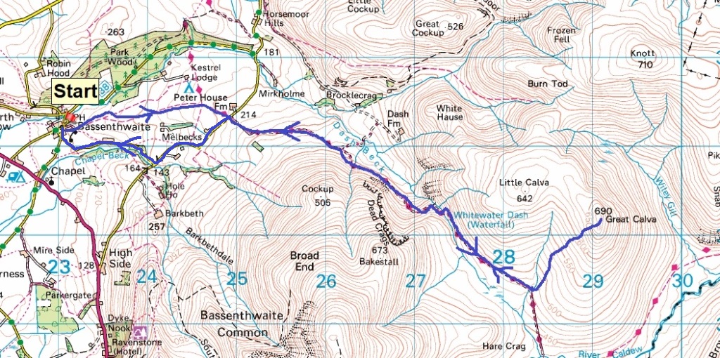 Route – Peter House Farm – Dead Crags – Dash Falls – Great Calva – Dash Falls – Dead Crags – Melbecks – Chapel Beck Bridge – Bassenthwaite