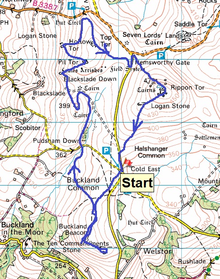 Route – Buckland BeaconTen Commandment Stones – Welstor RockBuckland PoundWittaburrowTunhill RocksPil TorHollow TorShovel StoneLower Top TorTop Tor – Blackslade Manor – Hemsworthy Gate – Rippon TorThe Nutcracker – Cold East Cross