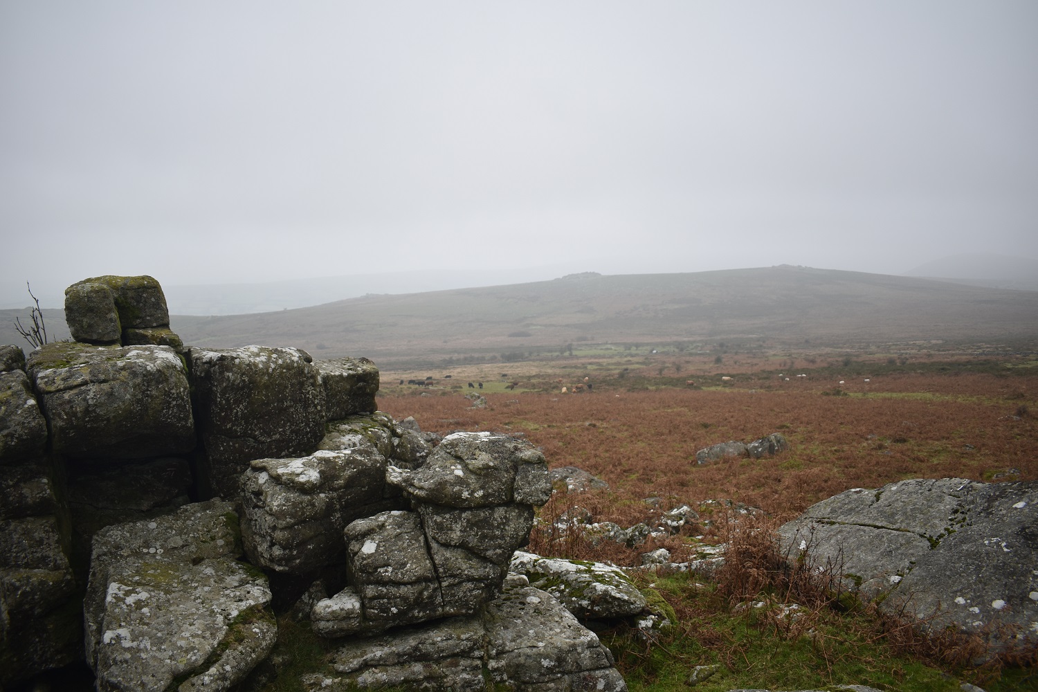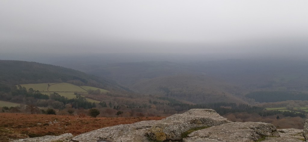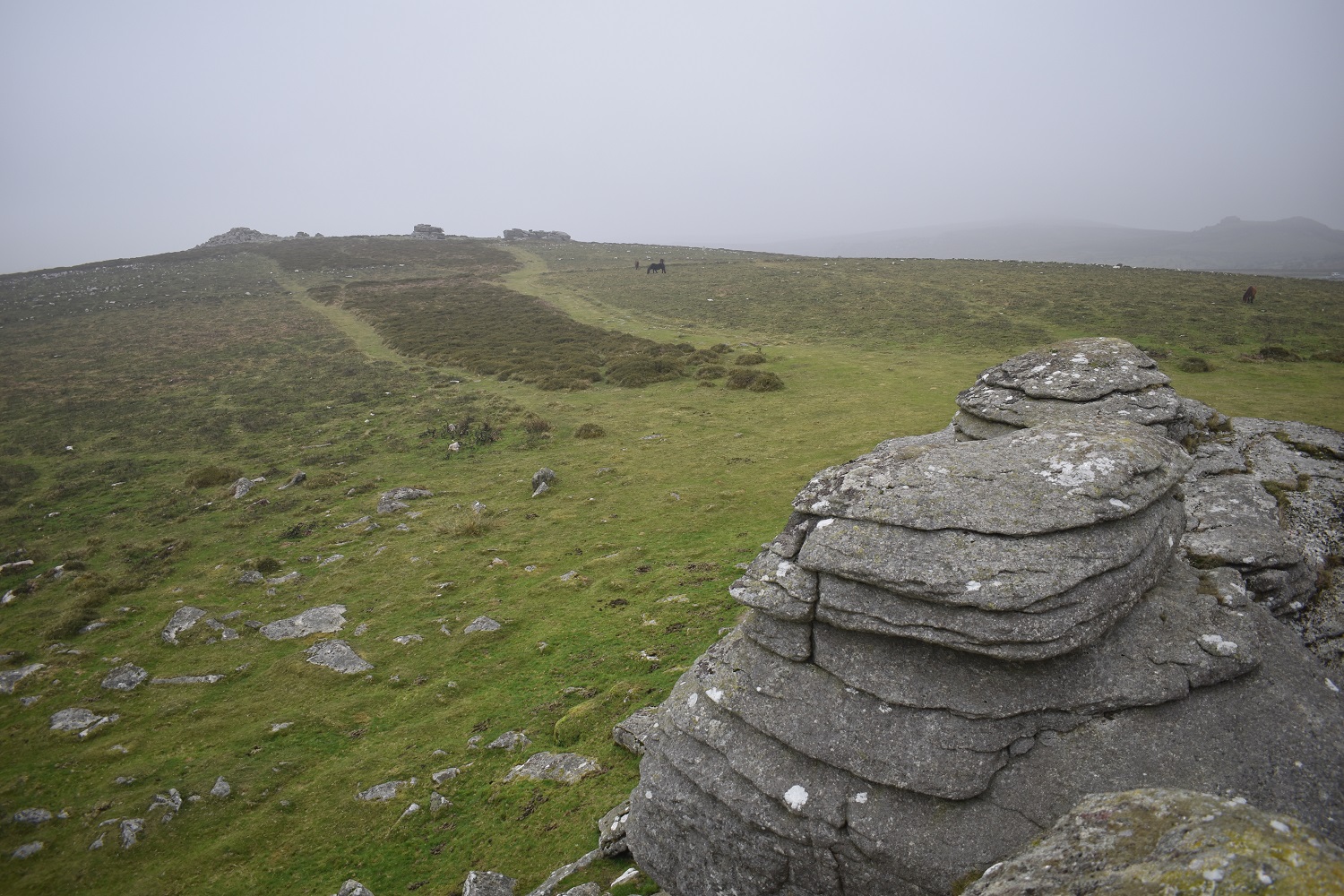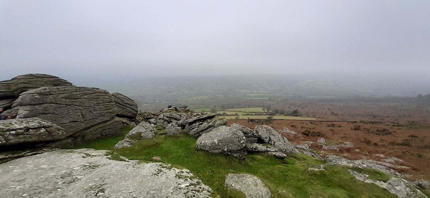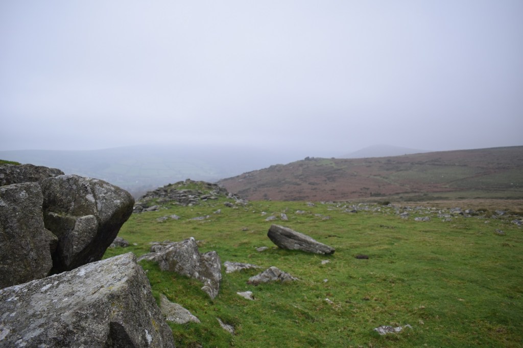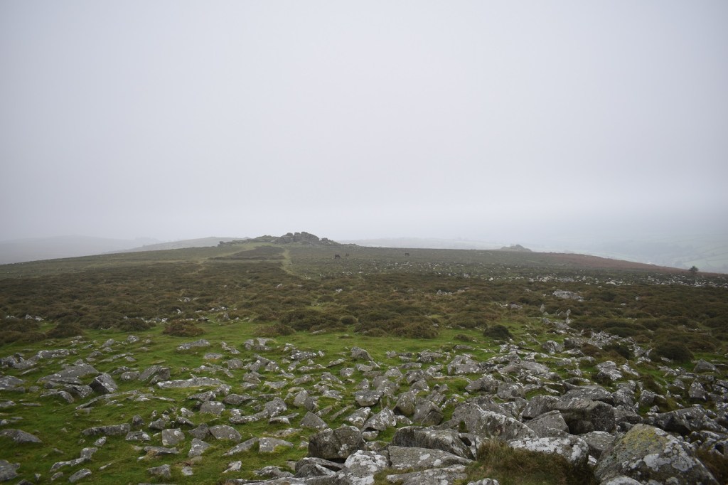 From the grassy top the misty shape of Chinkwell Tor appears. Hameldown is up to the left