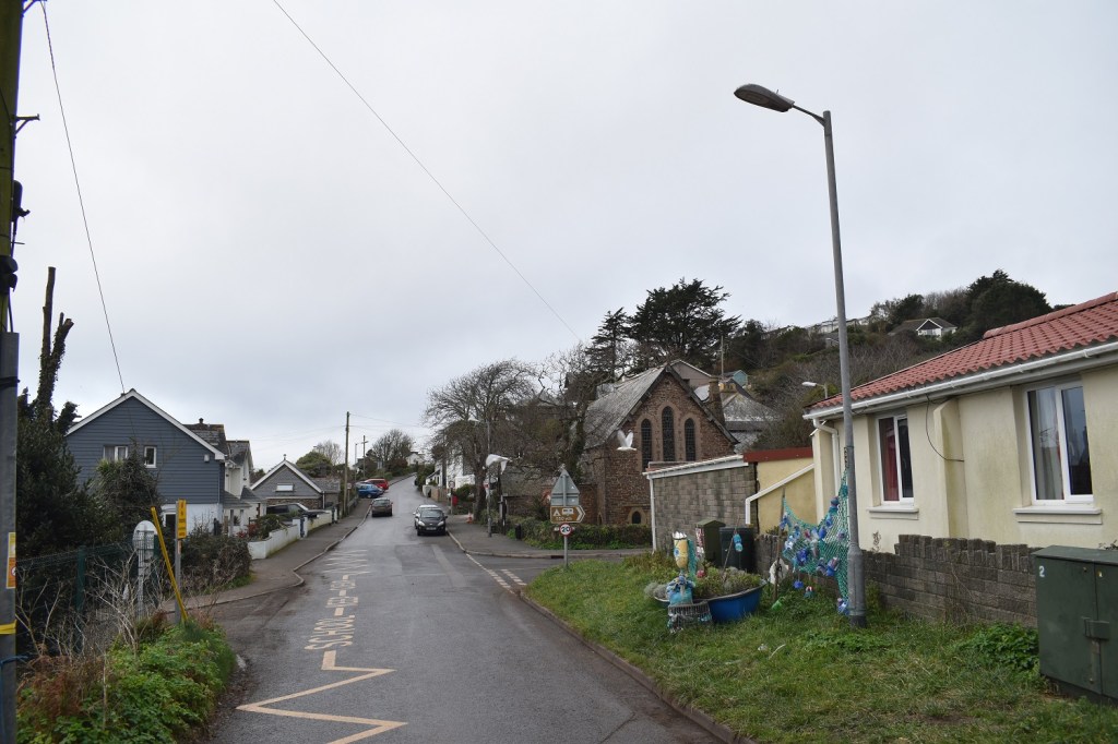 Passing through St Winnolls as some drizzle starts to drop. Rame Head in the distance