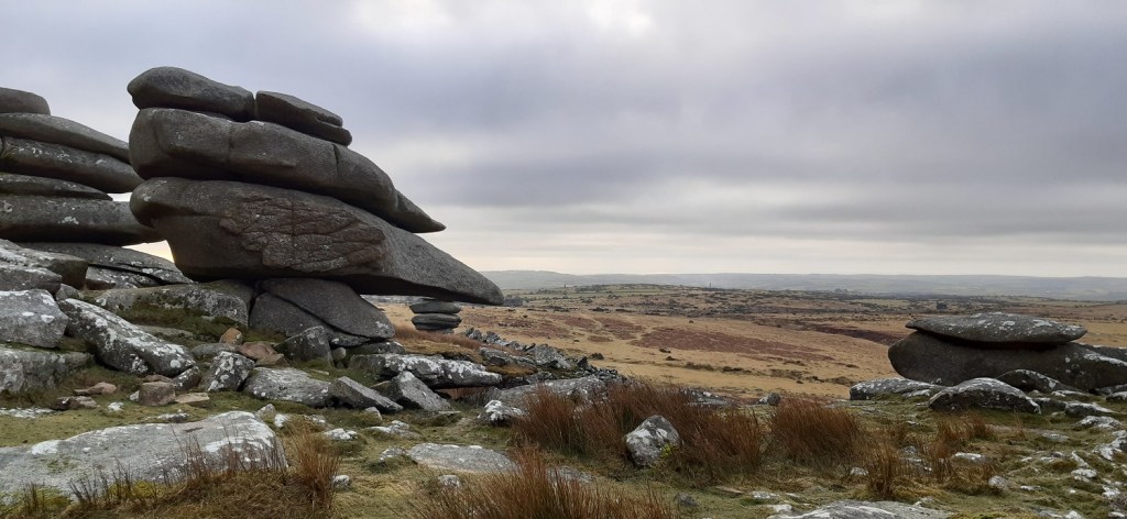 Bearah Tor, more huge boulders all stacked up and fantastically shaped piles. Kit Hill looking a bit gloomy in the distance