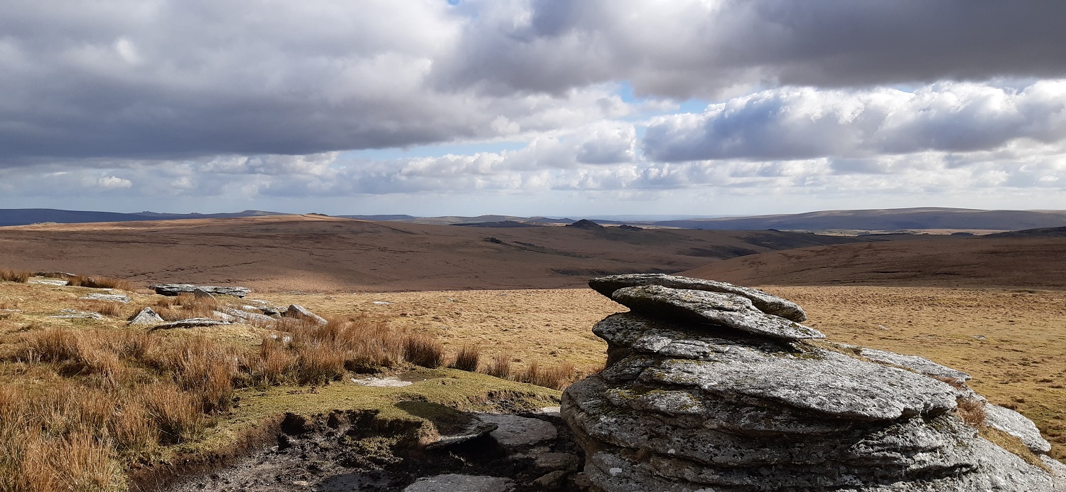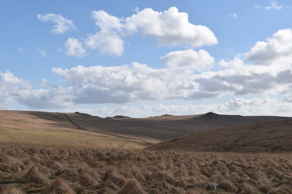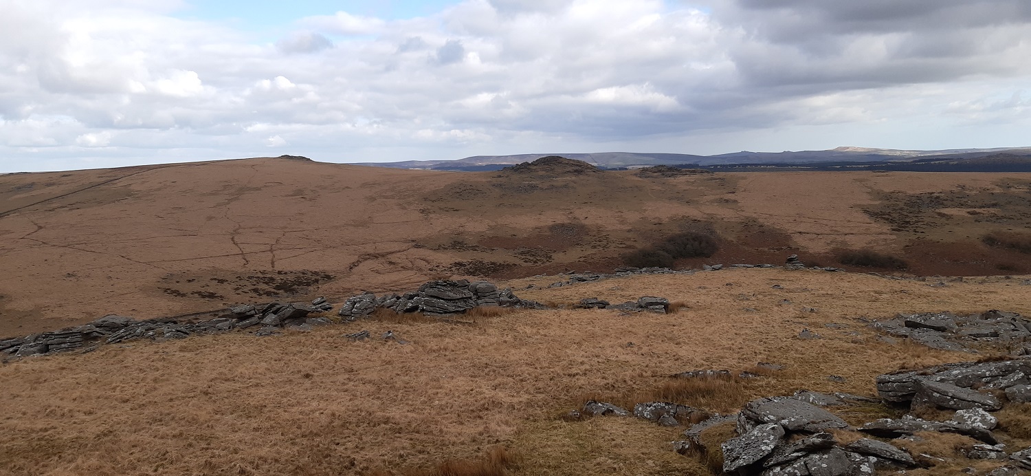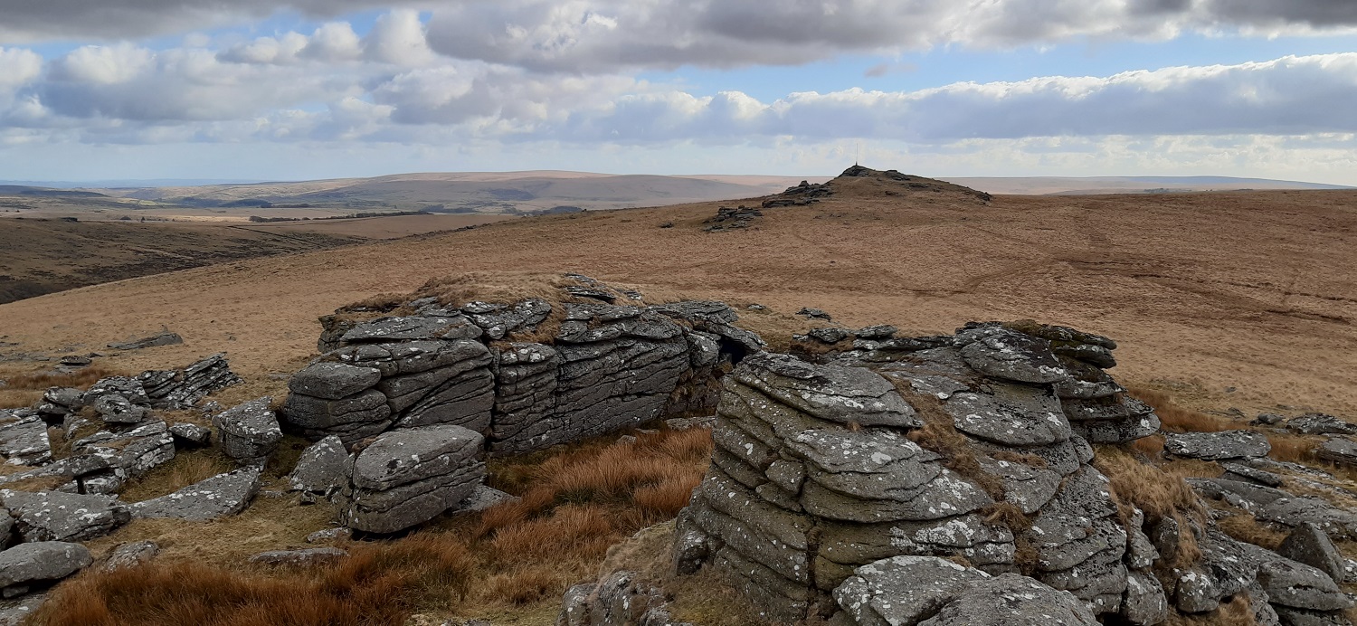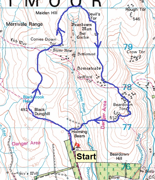 Looking out from Holming Beam, the valley of the Cowsic is on the right, Cowsic Head is in the shade at the far end of the valleyLooking to the Princetown mast as we walk the tussocky ground to Black DunghillOn Black Dunghill, looking across to the Beardown Tors on the right, Lydford Tor to the left, in the middle in the far distance is Higher White TorLooking the other way to Great Mis TorThe dark looking White Tor, Cocks Hill is on the right in the shadeWe are heading for the Lych Way now, the ground below is still tussocks, again Beardown Tors on the right, Lydford Tor is by the wall on the left. Higher White Tor is at the backGlorious views from Conies Down Tor along the Cowsic River which is wriggling away towards Two BridgesHeading up towards Maiden Hill now, at the back the mast at Princetown on the rightMaiden Hill with light and shade. Cut Hill at the backBack into the tussocks as we walk towards Cowsic Head. The distance views are of the high ground around Ryders HillCowsic Head out along the valleyHaving circled around Cowsic Head we reached Beardown Man, the second tallest menhir on the moor. Linda gives a bit of scale to it. Great Mis Tor is back right. Devil’s Tor is to the left here.Looking east towards Rough Tor, the flat topped Hameldown is to the right of that, and further right is Rippon TorWe are heading this way next towards South Devil’s Tor, pointy Longaford Tor is in sightBeardown Man is left, Devil’s Tor is right and Fur Tor can be seen away in the distanceSouth Devil’s Tor, the valley above the tor is the West Dart holding the river of that nameLooking from South Devil’s Tor towards Great Mis TorOn Lydford Tor now, the bridge over the Cowsic is down by the green triangle of grass with the paths leading away from it. Holming Beam is by the trees above holding the car parkThe three Beardown Tors from Lydford TorThe wall of rock on Beardown TorsLooking towards the tor holding the army flagpoleLooking the other way, Linda on Beardown Tors, the West Dart River wriggling away behind. Crow Tor by the wallLooking across the West Dart to Longaford TorNow by the army flagpole looking back to the northThe army flagpole, West Dart valley below and Hameldown in the distanceThe bridge over the Cowsic. Lydford Tor up on the right, Maiden Hill is back leftBack at the start, the majority of the view in shade now, with Cowsic Head catching the sun at the back