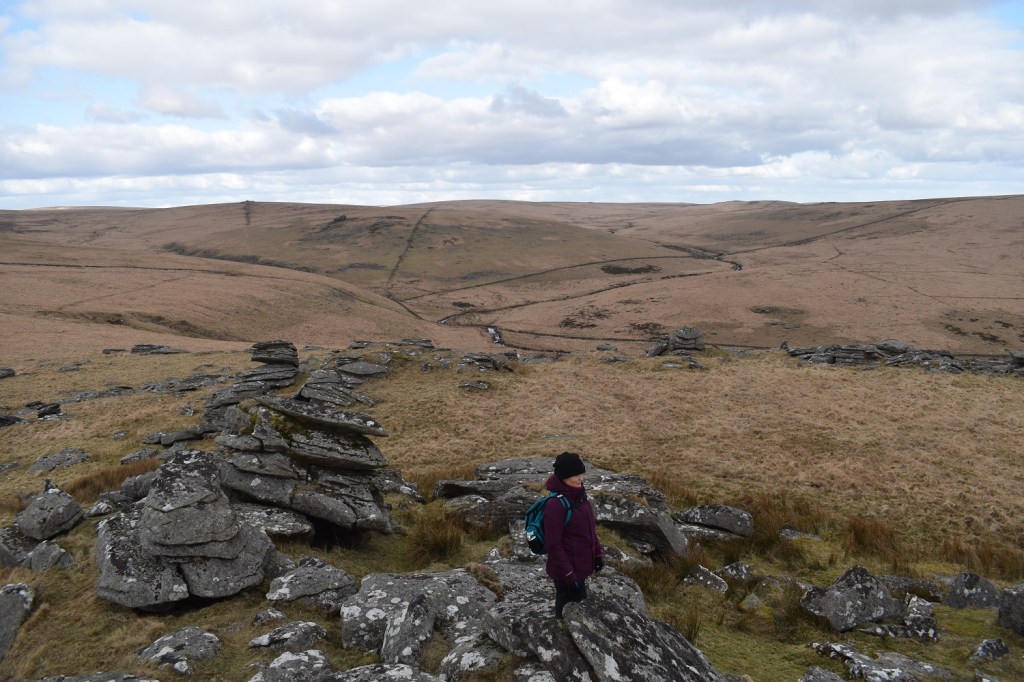 Back on Dartmoor this week having had a mixture of walking in different areas. We’d had some coastal and some Bodmin Moor recently and it was time to get back into the centre of Dartmoor. This is walk 21 of Round 2 of my D365 square hunt and involves L7, L8 and J8 and the area around the Cowsic River, picking up the tors situated around the head of this river. The valley itself, holding the river, provides some lovely views along its length, none better than from Conies Down Tor. The walk down from South Devil’s Tor can be boggy, especially at this time of year, as the ground is fairly flat between that and Lydford Tor, but we easily managed to avoid the worst of it. Then there is the start of this walk, Black Dunghill is an uneventful place, a green lump of tussocky grass, surrounded by soft ground, this will be the case until you cross the Lych Way and start the climb to Conies Down Tor. The weather was glorious today with plenty of sunshine, although the wind was bitterly cold up at the high points, it was a weekend of ten tors training and we could see a few groups walking the trails back towards Holming Beam to their pickup points, it would have been a cold night for all these groups.