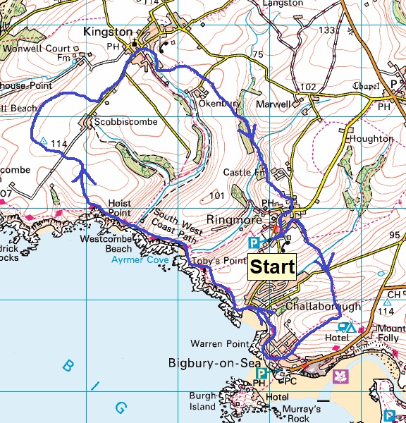 Route – Bigbury on Sea – South West Coastal Path – Ayrmer Cove – Westcombe Beach – Hoist Beach – Scobbiscombe – Kingston – Castle Farm – Ringmore