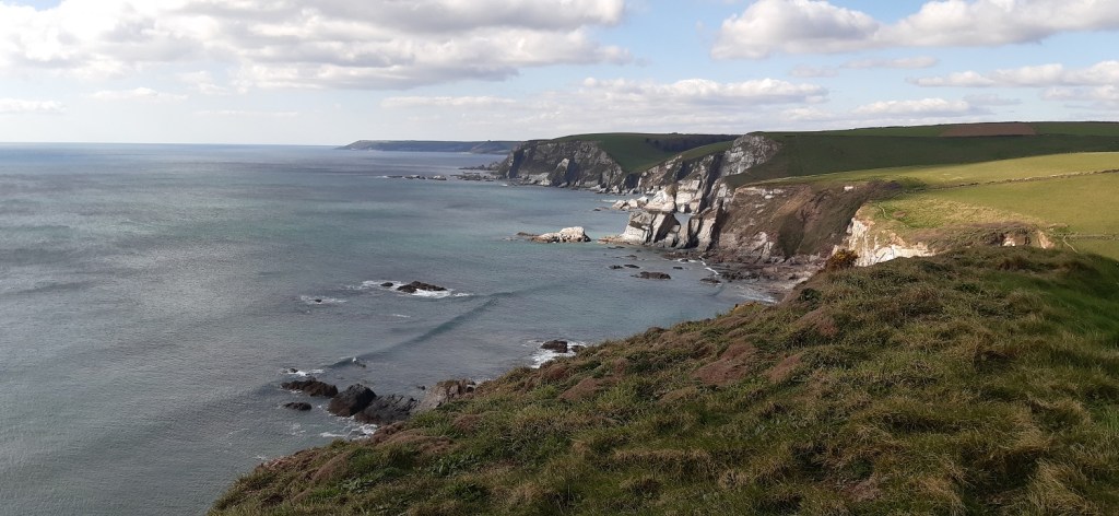 A birthday walk for Linda and a day off work as a bonus. This was a return visit to a brilliant part of the coastal path on the South Devon coast between Bigbury and Mothercombe, plus the lovely village of Ringmore. The walk along the coastal path is a classic rise and fall route, with plenty of drops down to a beach, followed by a rise up to a cliff top. The views are superb normally but on a day like today they were just perfect. This route took us inland across the fields towards Scobbiscombe and into the village of Kingston, before a lovely path took us across towards Castle Farm and back to Ringmore. It’s a walk of highlights, starting with the village of Ringmore itself and its thatched cottages, then some leg burning climbs to reach a path to take you down to Burgh Island, you then join the coastal path and walk around to Ayrmer Cove, before an up and down to Westcombe Beach. Then the leg punishing climb to Hoist Point, which is the highest point on the South Devon coast. We then headed in towards Kingston and the lovely villages and hamlets of Devon. The finish was a quick visit to the church in Ringmore, before a walk past the thatched cottages again. All done in glorious sunshine, not bad for the end of February.