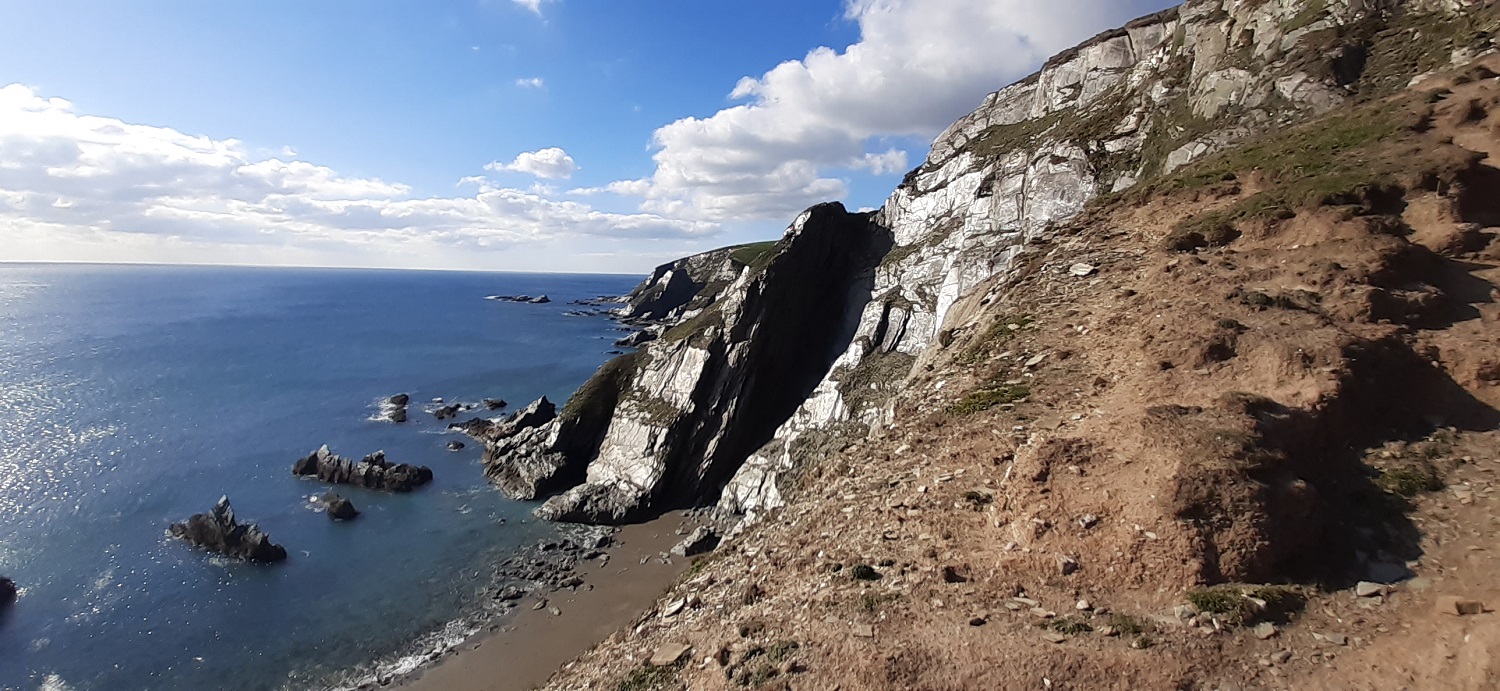 We had hit the top of the cliff and before descending towards Burgh Island we took in the views. Bigbury Beach to the left and Bolt Tail at the back. The rocks at Butter Cove stood upright