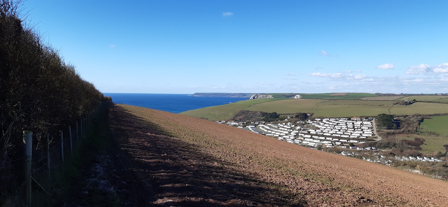 Challaborough holiday park is below, we need to climb the slope on the left first though, the legs get a workout!