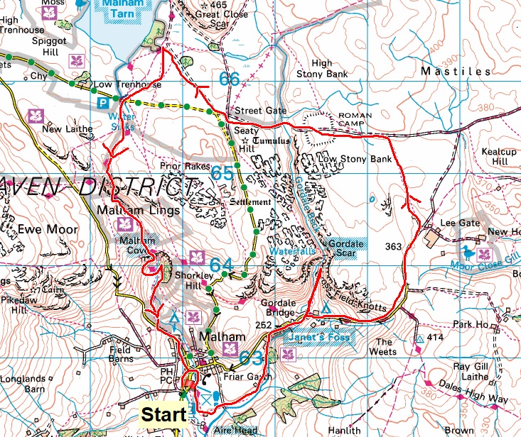 Route – Janet Foss – Gordale Scar – Lee Gate – Malham Roman Camp – Street Gate – Malham Tarn – Water Sinks – Dry Valley – Malham Lings – Malham Cove – Malham