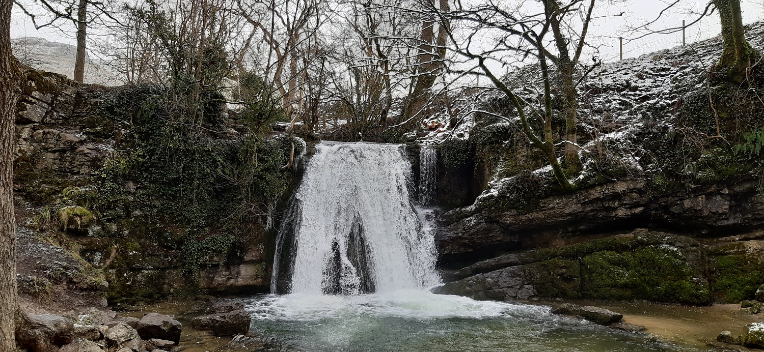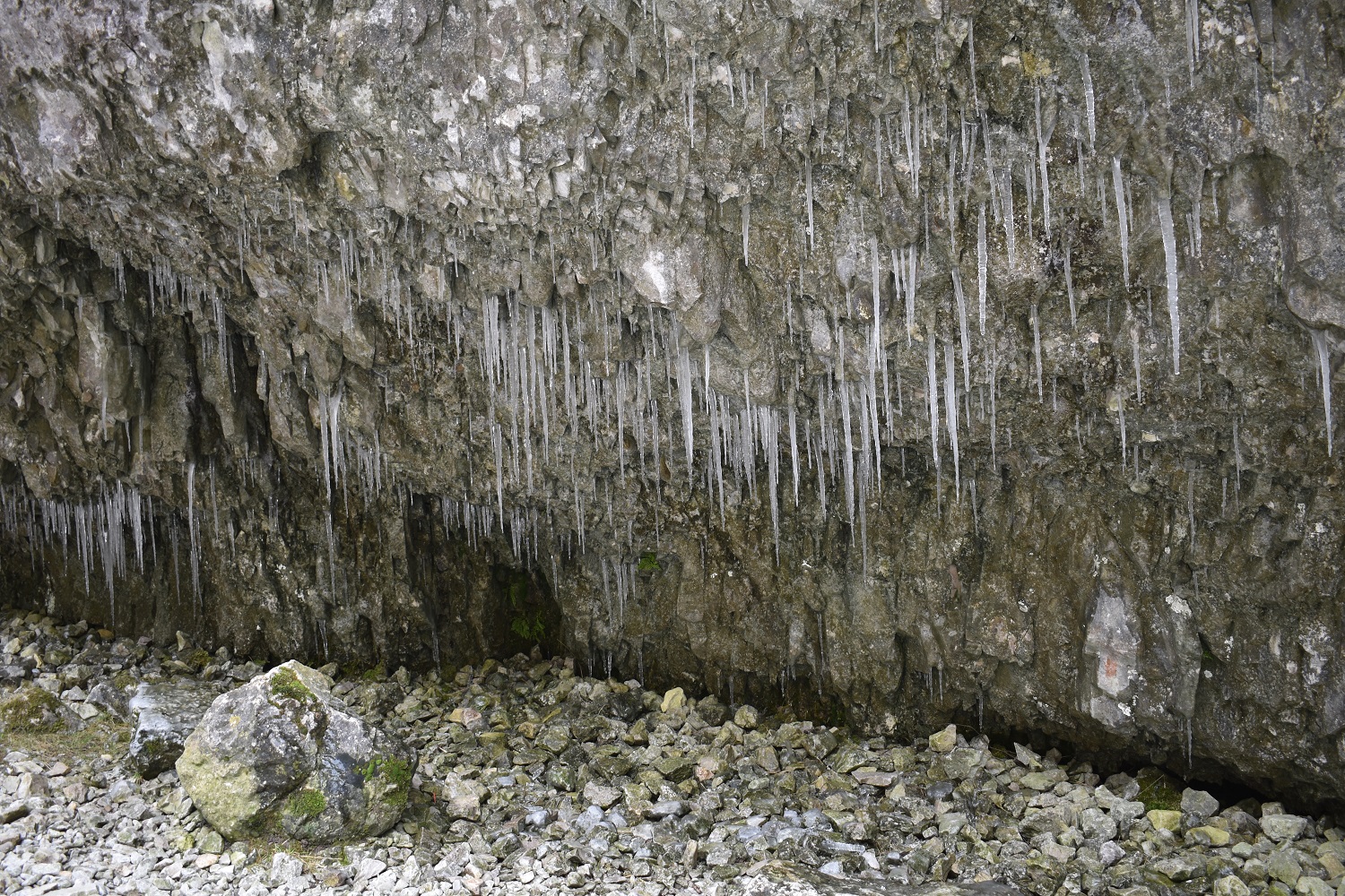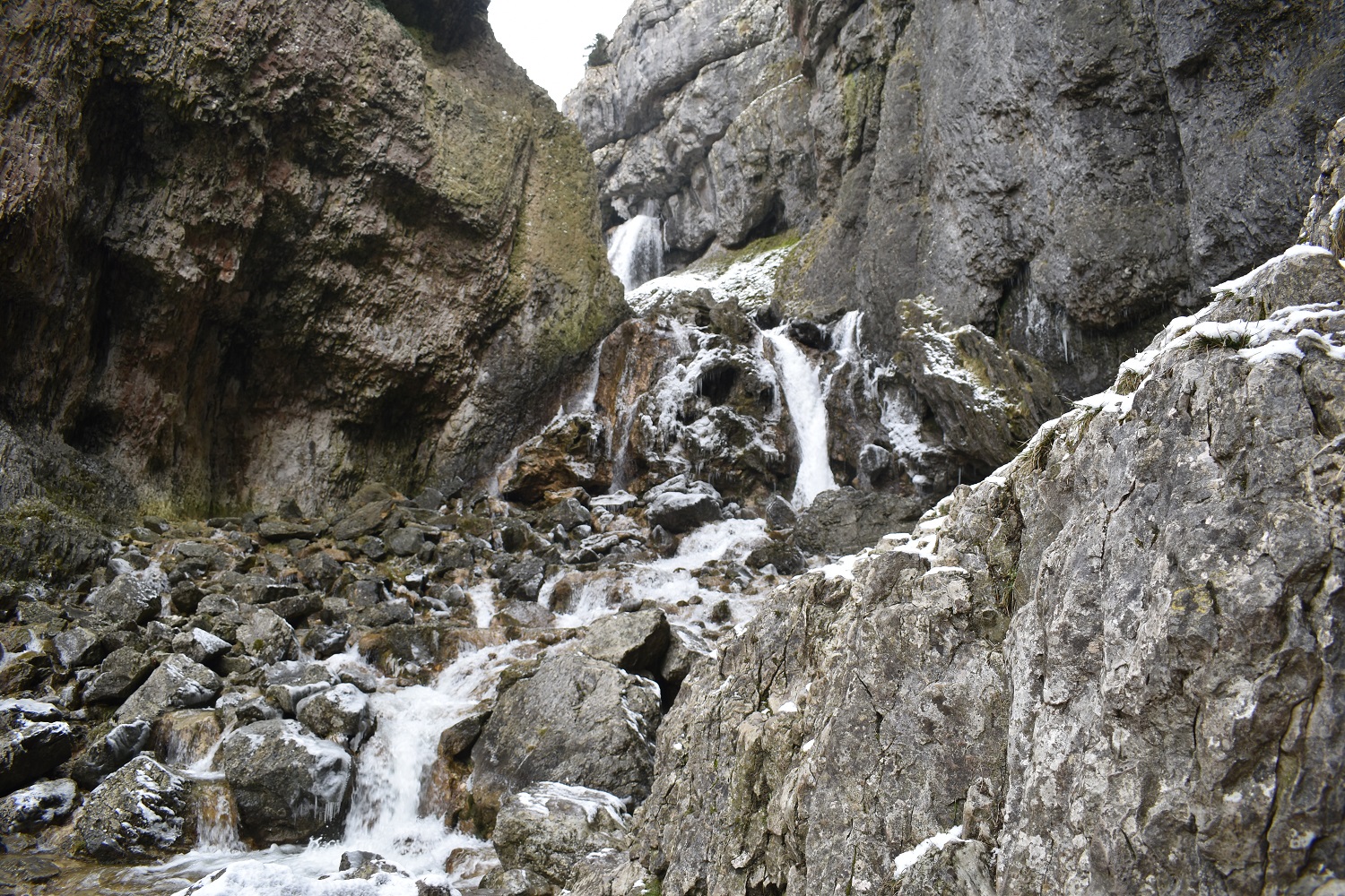 Now any first trip to the Yorkshire Dales wouldn’t be complete without a trip to see Malham Cove. I remember this walk from a TV programme called Britain’s Best walks, and I think it was at number two. Ade Edmondson (The Young Ones and Bottom fame) walked this route on the show, and I particularly recall him entering Gordale Scar. Now I’m pretty sure he was walking it in the summer months and the water coming down Gordale Scar was a little less than I saw, however it looked a good route. I was a bit apprehensive of the climb up the Scar waterfall and that only intensified when we drove in. To say there had been a bit of snow would be about right and it was cold, very cold. Still we set off from Malham towards Janet’s Foss and had a hope that maybe we could at least have a look. As it was we changed our minds and walked the road around to Lee Gate and up to the Malham Roman Camp and on to Malham Tarn. The tarn wasn’t the easiest piece of water to take a photo of, so we headed back down towards Dry Valley to see where all the water went when it comes out of the tarn. The truth is, it disappears underground into limestone and out at Malham Cove. This part of the walk was superb, Dry Valley pops you out high on a cliff edge before depositing you at the top of Malham Cove on the limestone pavement. We had a good look around having walked past the signs for the Samaritans, before following the muddy path down to the bottom to see where the water exits from the sink holes. All that was left was an easy walk out to Malham and a fine pint in the pub.