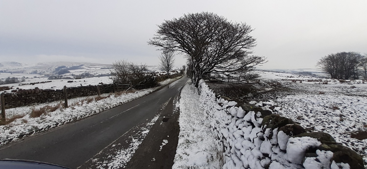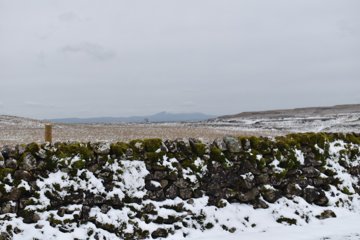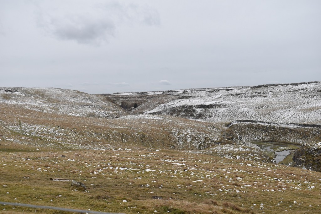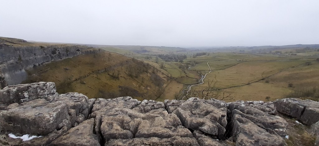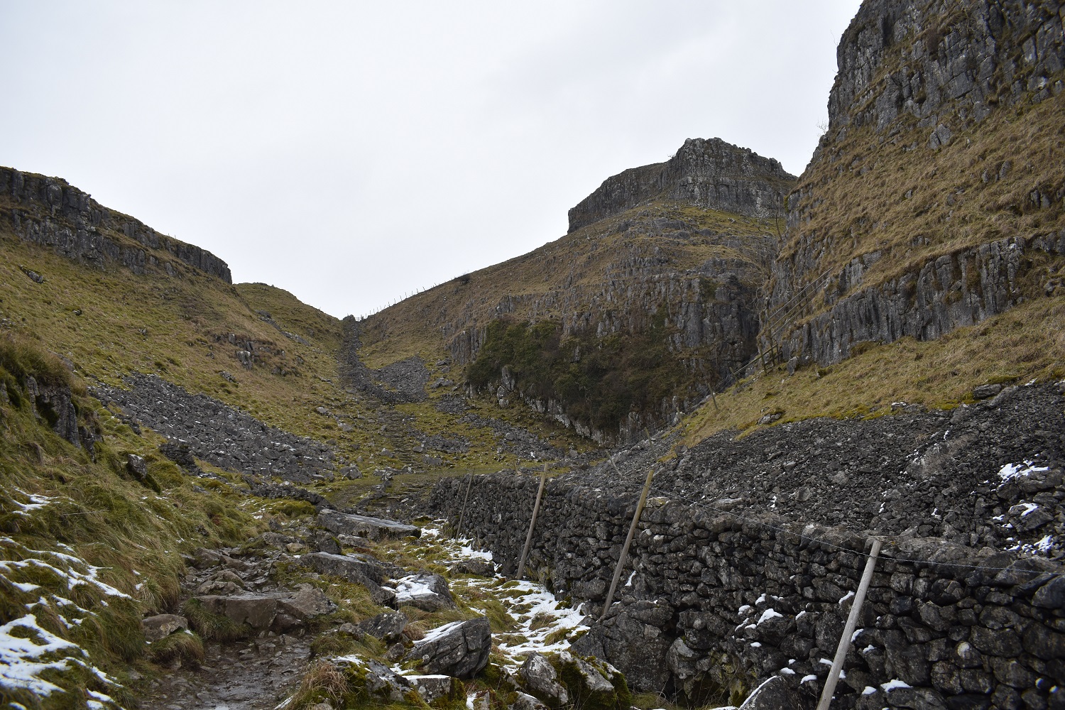 This photo is from our drive across to Malham, we were due to stay in Gargrave for two nights and had left the Blackpool area that morning, the road I’m on would look completely different the next day when we walked towards those hills, Attiremire Scar is among many over there. The only problem was we didn’t realise I’d taken a photo of this already and when we walked here the following day and we didn’t recognise the road at all. That walk is to come, for now it looks completely bleakThat’s our first look at Malham CoveAnd the road itself, it was in a decent condition considering it was very quiet up here. The temperatures were rising today so this was pretty much the last we would see of the proper snow, everything was white up here, walls, trees, all except the road, thankfully.Into Malham now and on with the walkStarting out across fields to join the Janet’s Foss pathA babbling Gordale Beck threads its way through the whitenessInto the woodland which holds Janet’s FossJanet’s Foss, naturally that is Gordale Beck coming over the top of itPopping out the top of Janet’s Foss, crossing the road and passing the refreshment van we started out towards Gordale ScarLooking back out as we entered a very cold valleyAs we started to round the corner the path became an ice rink and we skated to the rockier section to gain some grip, all thoughts of ascending this way disappeared. Far too icy and too much water coming over the waterfall. But what a sight this is, Gordale ScarThe ice was starting to melt despite it being very cold in here, I saw one of these drop so stepped back away from the cliff face.I managed to get to here but no further, the rocks were far too slippy, and the Wainwright route up the waterfall which zigzags up the middle (left of the main waterfall) looked way too icy. Not for us this time. We retraced our steps to the road and headed uphill.Heading up the road now, snow continues to melt. The entrance to Gordale Scar is on the right down there. Kirkby Fell is back middleLeaving Lee Gate and heading for the Malham Roman Camp, Linda wants more of the snow so insists on walking alongside the wall where there is plenty!Malham Roman Camp, used as a temporary marching camp to prevent a rebellion from the Brigantean Warriors in the area. The camp would have had a low ish banked up wall with a ditch around.After a bit of working out which way we were looking we think this is Pendle Hill in the distance, looking across the top of the area holding Dry ValleyStill walking on the snow whenever possible!Approaching Malham Tarn, with the trees around it, it wasn’t the easiest to get a decent picture of it. I reckon climbing one of the nearby hills would maybe give a better view, Great Close Scar is probably the best optionThis the top end of Gordale Scar, we should have walked up and out of that and across the limestone pavement to the rightAfter leaving Malham Tarn we walked towards an intriguing area marked on the maps as Water Sinks. The water is the outflow from Malham Tarn and seems to head over there under that wallAnd just like that its gone, there is one sink hole over there under the wall and this one here. You can hear the water falling inside what must be a caveWith no water heading this way this is now called Dry Valley. The valley is narrow, slippy when wet with the limestone rocks and caves in the walls of rocks on the left as you go down.And then you pop out on to this amazing ledge in an area called Malham Lings, areas of limestone pavement all around and Watlowes Dry Valley running away towards the top of Malham Cove. A rare shot with myself in it.Amazing view without yours truly spoiling itStunning limestone scenery as we walk out of the dry valleyWe’d passed a few signs for the Samaritans so we knew it was coming, the view off the top of Malham Cove, the ground was very slippery all around here, thick mud, greasy rock so this was as near as I got safely.Limestone pavement above Malham CovePavement and the view over the cove towards Malham villageWe’d dropped down a muddy slippery path to the bottom. The water sinks had brought the beck here to pop out at the bottom of the cliff face. Above us a curved wall of limestoneOne last look back at Malham Cove as the drizzle started to fall a bit