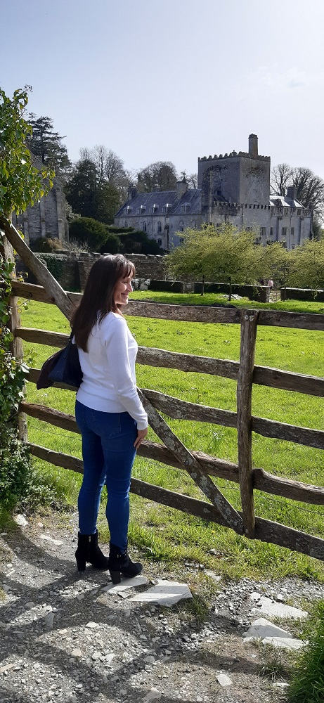 Buckland Abbey behind Linda, the exterior still has the look of an abbey but you can see the alterations which have taken place