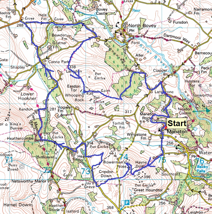 Route – Manaton ChurchHayne Down – Bowerman’s Nose – Jay’s Grave – Cripton Down Tor – Heathercombe Fisheries – Canna Park – Barramoor – The Watching Place – Beetor CrossHele Cross – Manor Golf Course – Easdon TorFiggie DanielBarracott Tor – Neadon – Manaton Rocks – Manaton Church