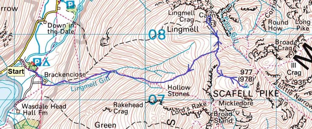 Route – Lingmell Gill – Hollow Stones – Lingmell Col – Lingmell – Lingmell Col – Scafell Pike – Lingmell Col – Hollow Stones – Lingmell Gill – Brackenclose