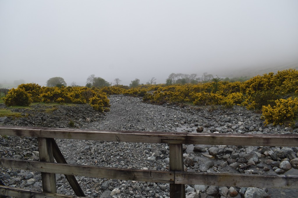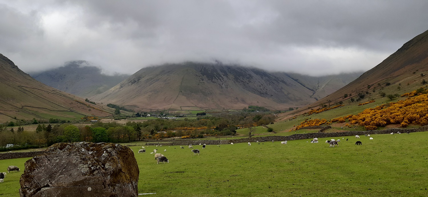 Crossing a dry looking Lingmell Gill, lots of sweet smelling gorse around, but the cloud is right down on all the area. It turned out that the Scafells was the area where the cloud was down the most, with around 70% of other tops clear, particularly in the Central and Eastern areas.Starting out, the mist was very thick and damp, so much so, that Linda had droplets gathering on her hair at times on the way up. The mist was very thick as we ascended, Here we cross Lingmell Gill on the way to Hollow StonesYours trulyInto Hollow Stones and the cloud looks to lift a littleLingmell peeking up ahead and some blue sky, maybe the cloud is lifting as per the forecastSwirling cloud and the sun bursting thoughAs the cloud lifts so the train of people becomes clearScafell Pike, but not yet for usLingmell is our first targetLooking back across Lingmell Col to Scafell Pike as we climb to LingmellThe cloud is swept away only to be followed by another bank of cloud. The Corridor Route comes up from that directionLinda at Lingmell summitLooking back down to Lingmell Col as the next bank of cloud rolls inThe two cairns over there have a great view down to Wasdale normallyLooking down to Piers Gill, its very rocky and steep but the true scale of it is lost in the low cloudAs we descended off Lingmell a gap appeared in the cloud, like a letterbox opening. Glaramara could be seen as could a distant Helvellyn ridge, it looked much clearer that way. Great End is the slope dropping down from the rightAgain blue skies as we start to climb Scafell PikeAnd a clear Lingmell, for nowScafell Pike summit, I didn’t bother with any photos on the last part of the climb as there was too many people and no viewWe sat for a bit away from the summit and ate some lunch, our progress up here hadn’t been quick at all. But it was nice to get views towards Broad Crag which came and then went quickly. We left the summit area to join the queue of people descending downThe brilliant fix the fells are out again on the path through Hollow Stones, as we descendAs we reached the half way stage down the cloud has lifted enough to get some views of WasdaleAnd the cloud keeps lifting. Illgill Head is to the left (we will be there on our next walk) and Buckbarrow is now clear at the far end on the rightAlmost down nowOn last walk across the field and we are into the car park, here we look across Wasdale Head to Kirk Fell with the cloud around half way down (another one we would visit this week)Even as we drove away from Brackenclose the sun had come out but not totally cleared the cloud away from the Scafells and Lingmell to the right, nor Great Gable which would normally be at the back. Yewbarrow on the left looks glorious though. Not to worry about this view we would get another go at it later in the week. So another ticked off for me but with the people and the cloud it turned out to be our least favourite walk of the week. Luckily for us our favourite two are still to come…..